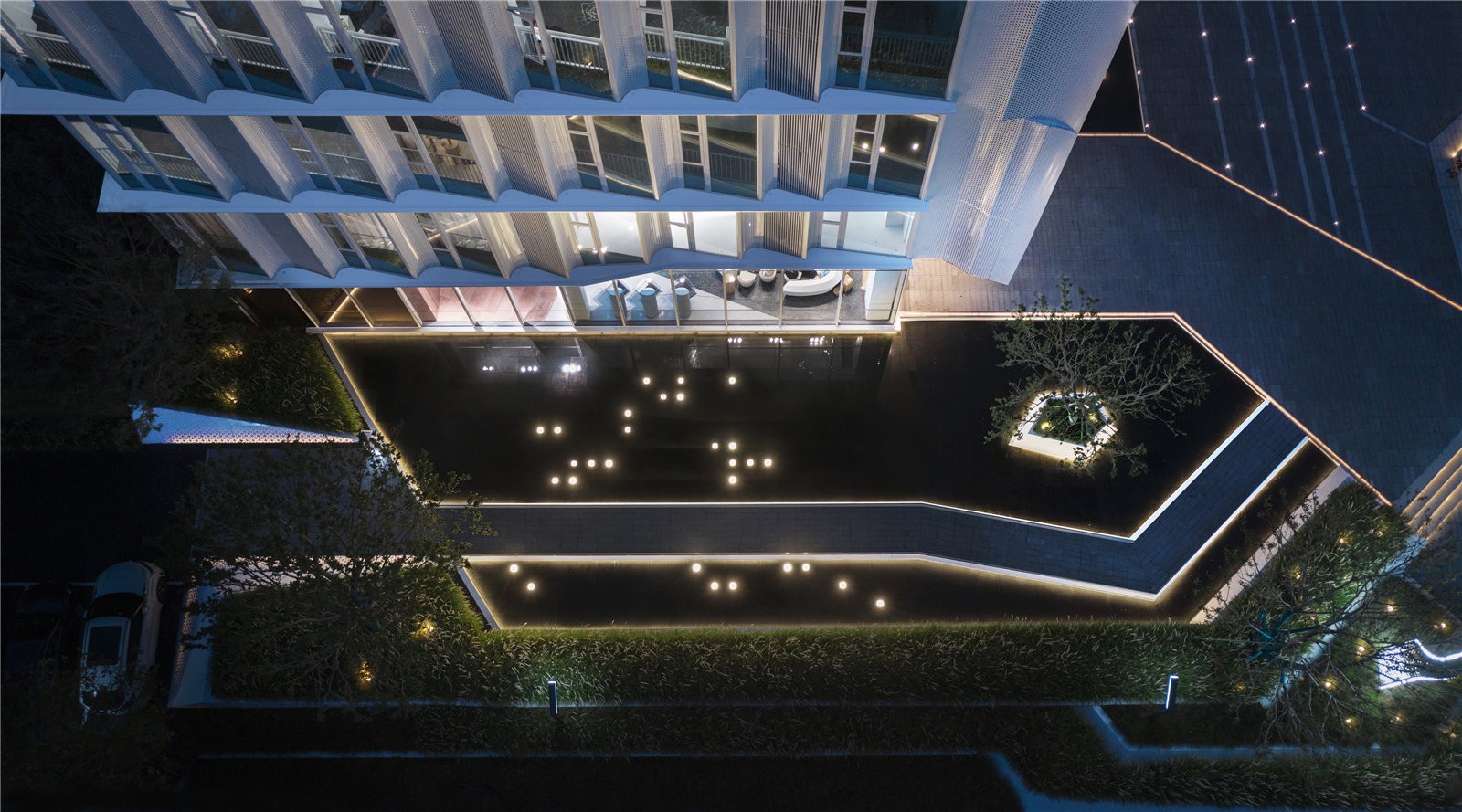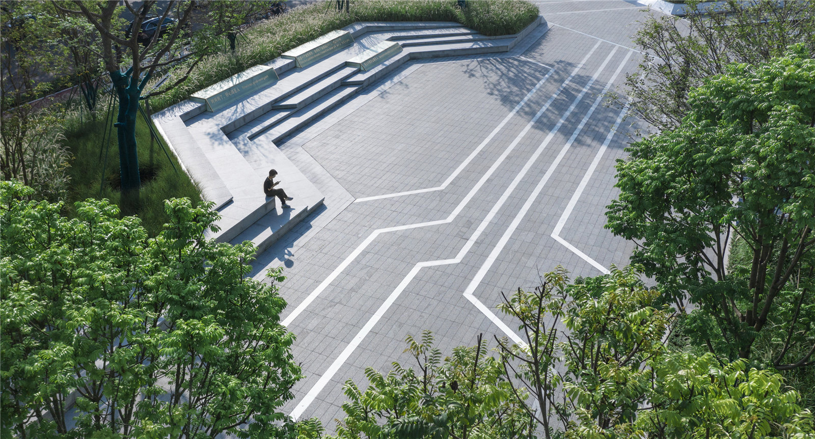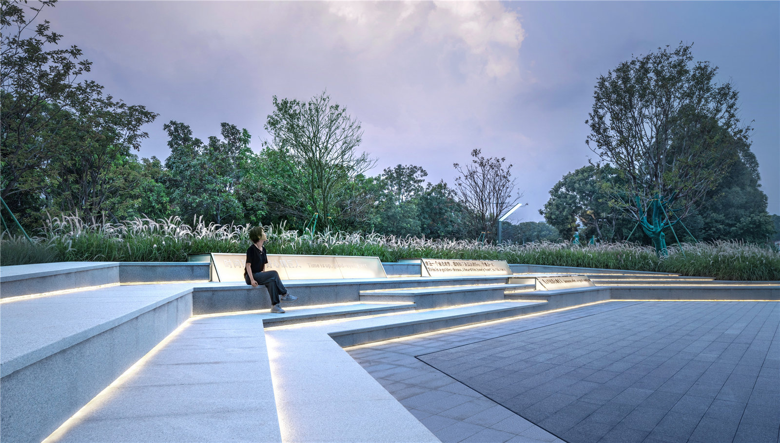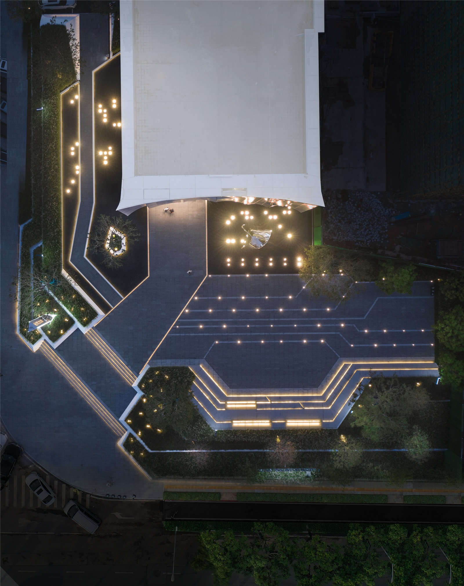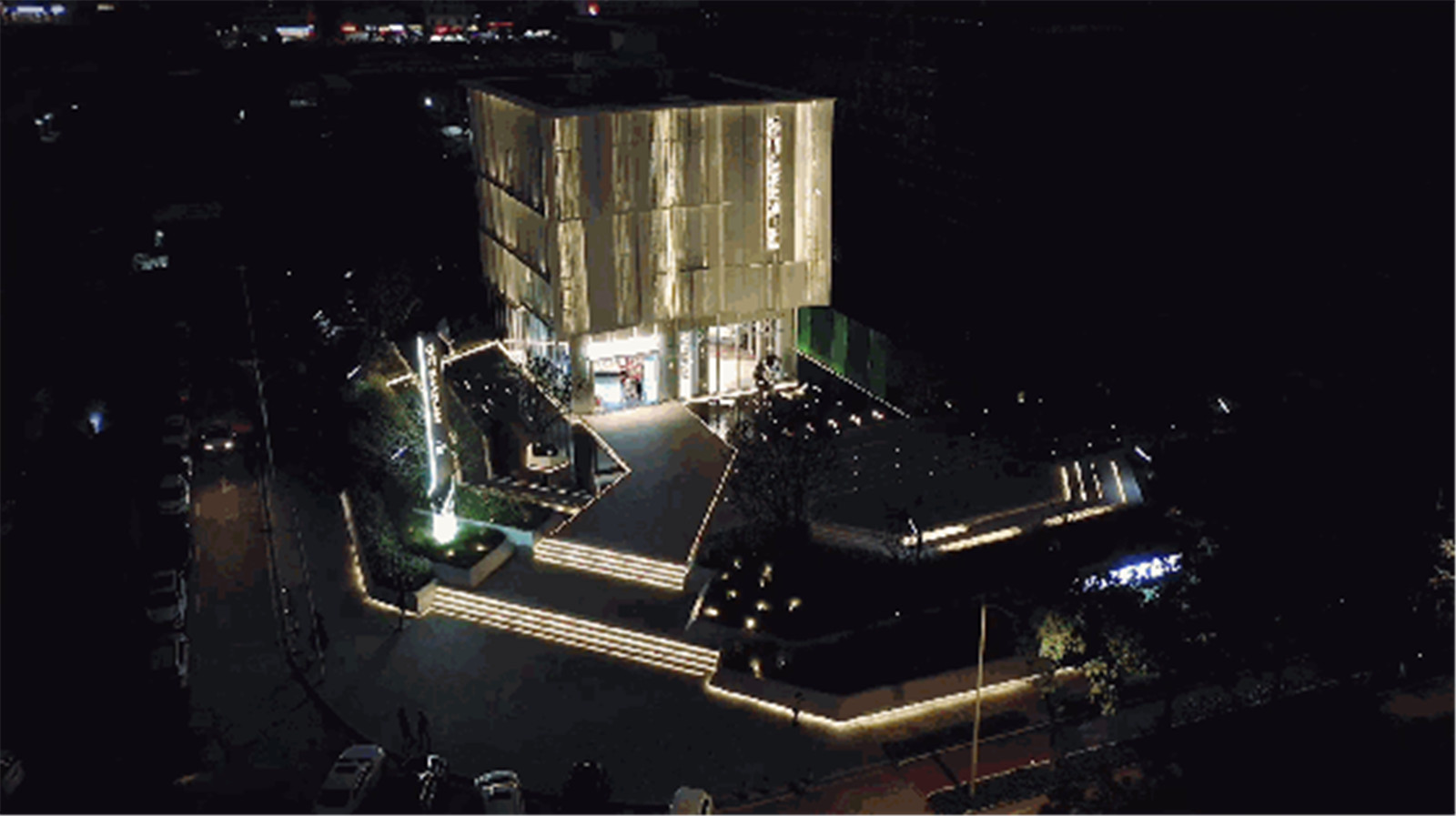 依據(jù)場(chǎng)地高差,通過(guò)兩級(jí)臺(tái)階,在燈光的引導(dǎo)下,層層遞進(jìn),利落的線條勾勒出種植池的形狀,遠(yuǎn)處的建筑泛著潔白的光,吸引著追逐夢(mèng)想的人們。