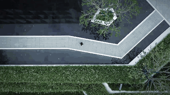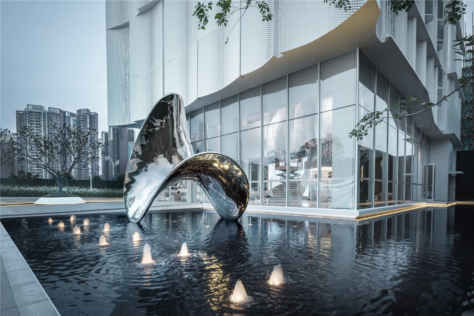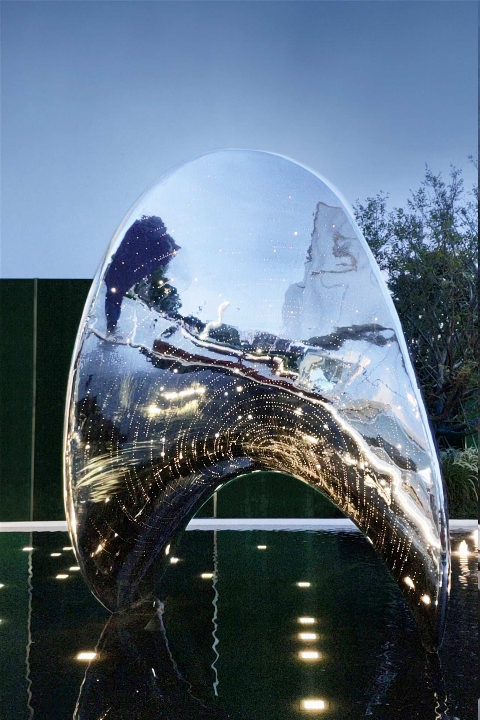 一池漣漪倒影著幕布里上演的一切,巨大的雕塑像一張落入水中一張卷曲票根,星星點(diǎn)點(diǎn)透出的微光是對(duì)過(guò)去的紀(jì)念也是對(duì)未來(lái)的向往。