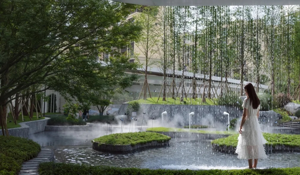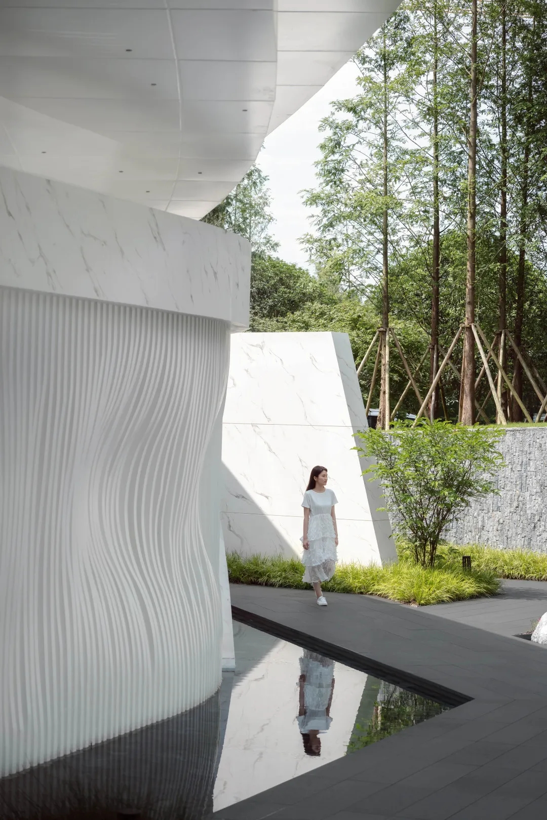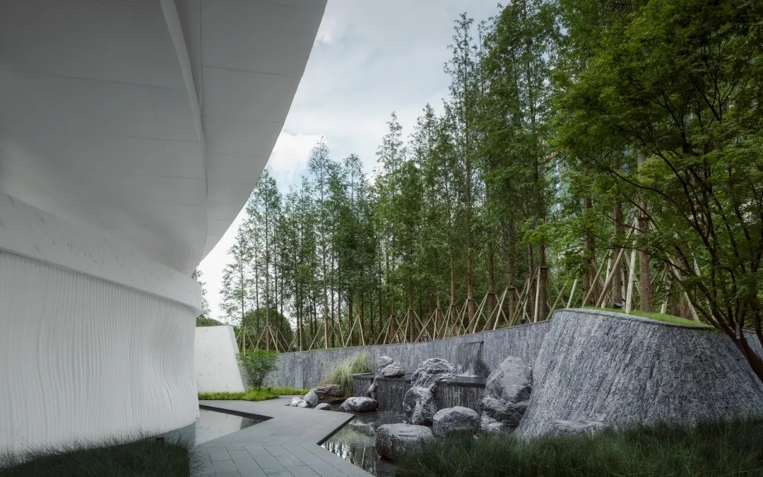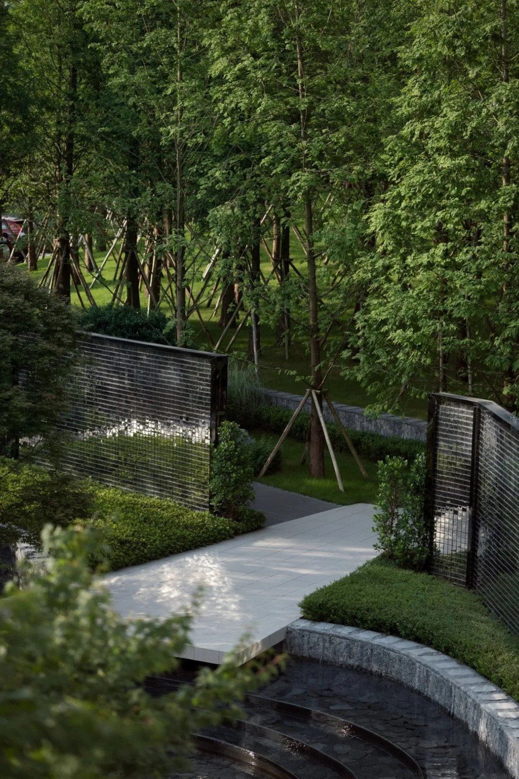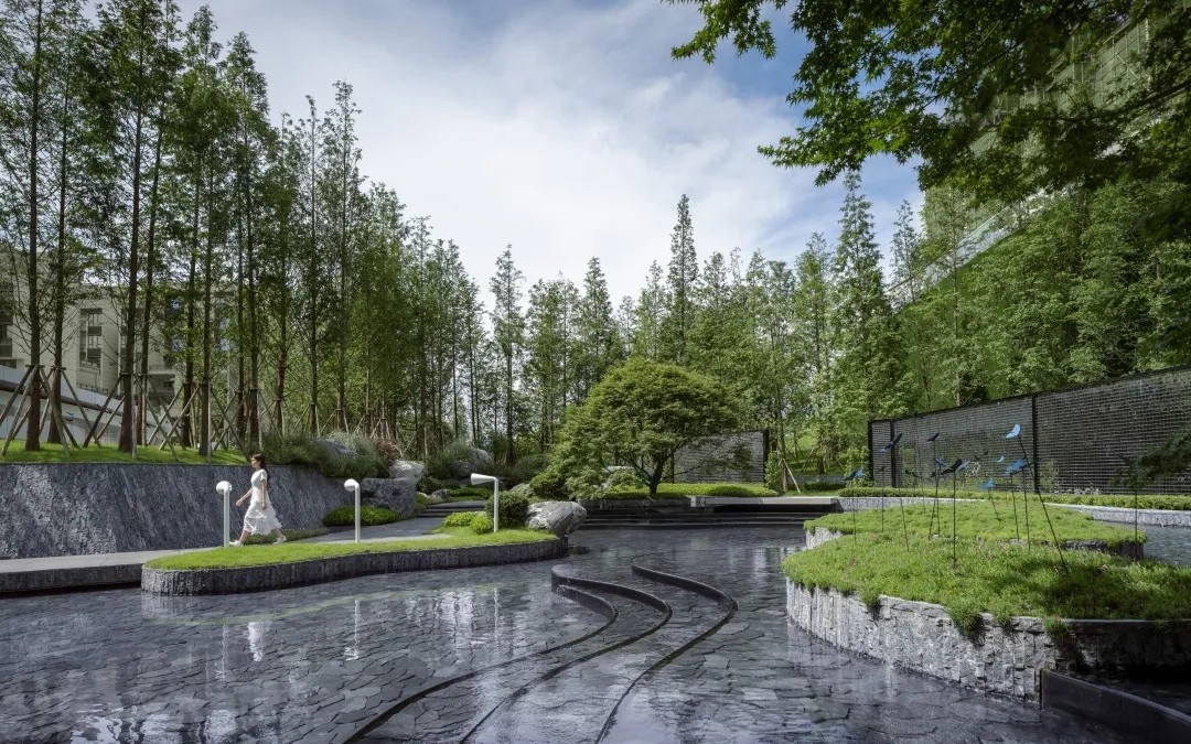 進入門樓,采取兩片包裹式的景墻結合鏡面水和觀賞草形成一個山澗峽谷型的空間,迎面而來的是由300棵水杉形成的茂密森林。