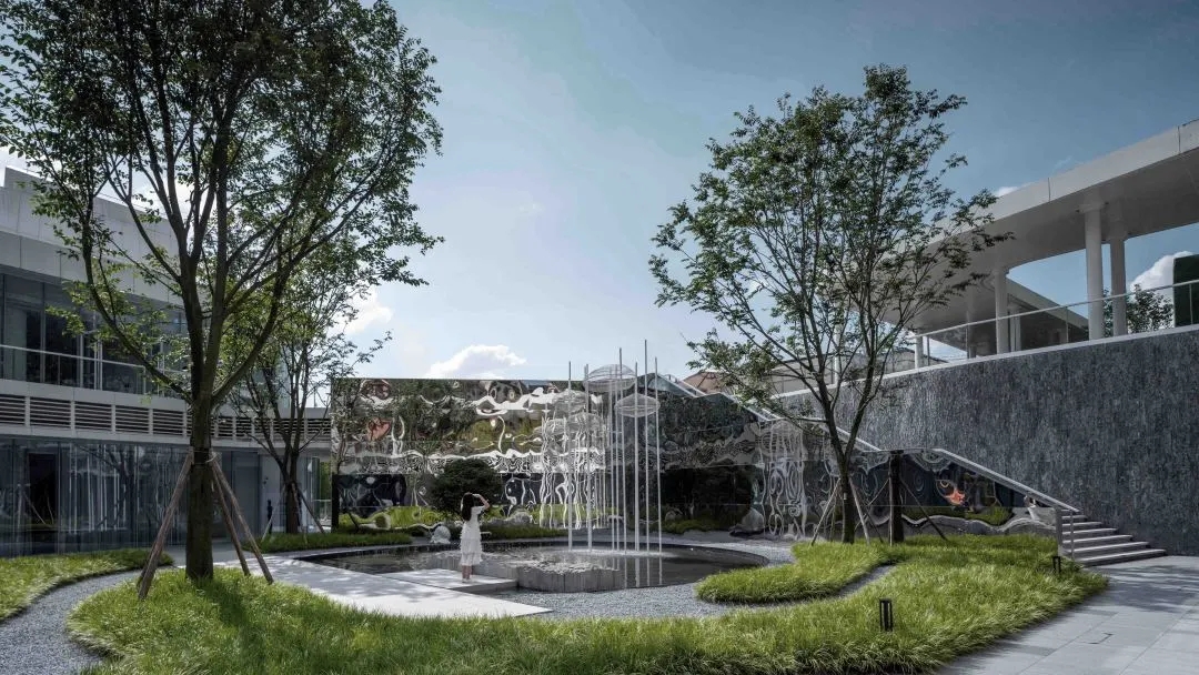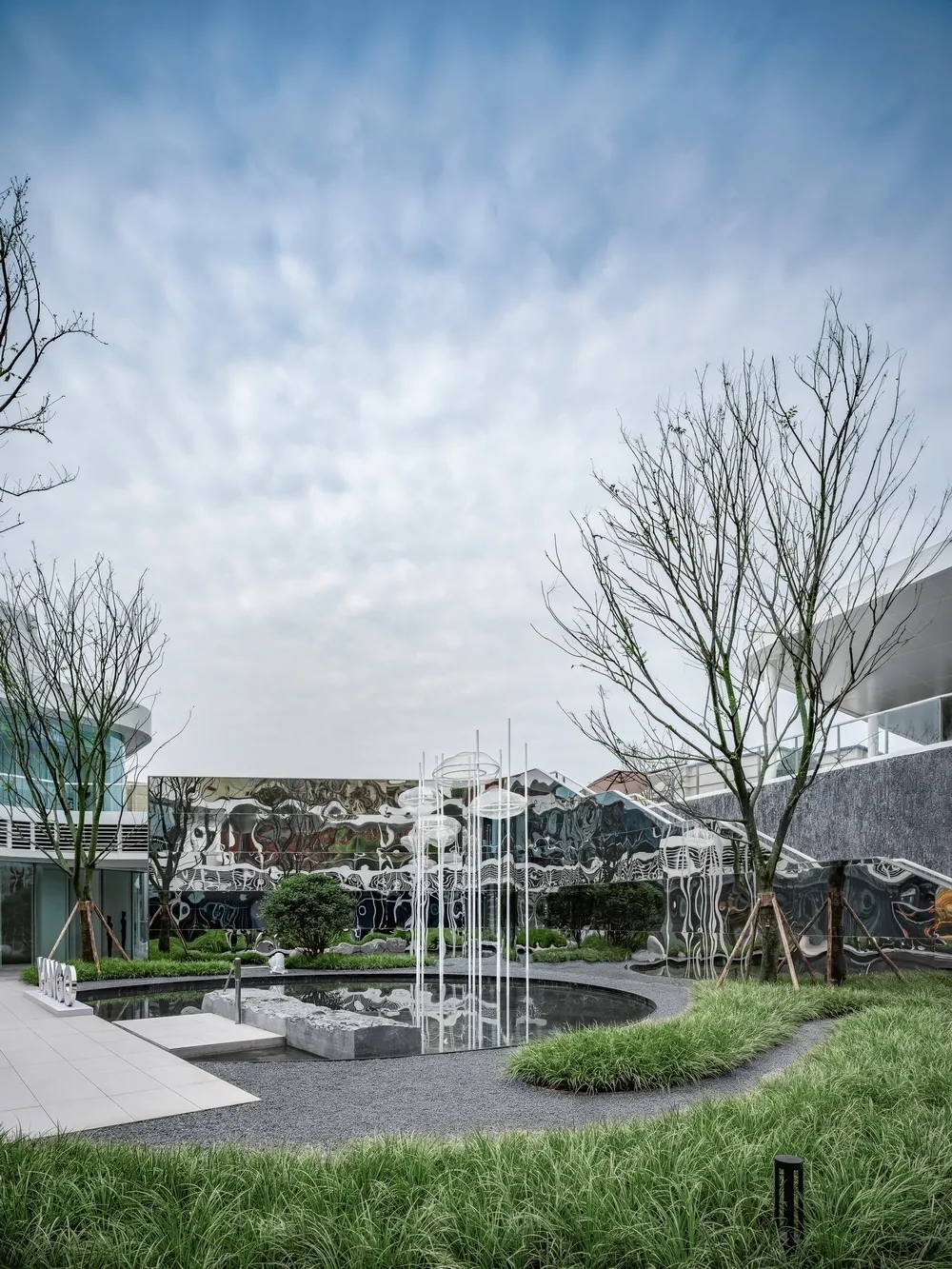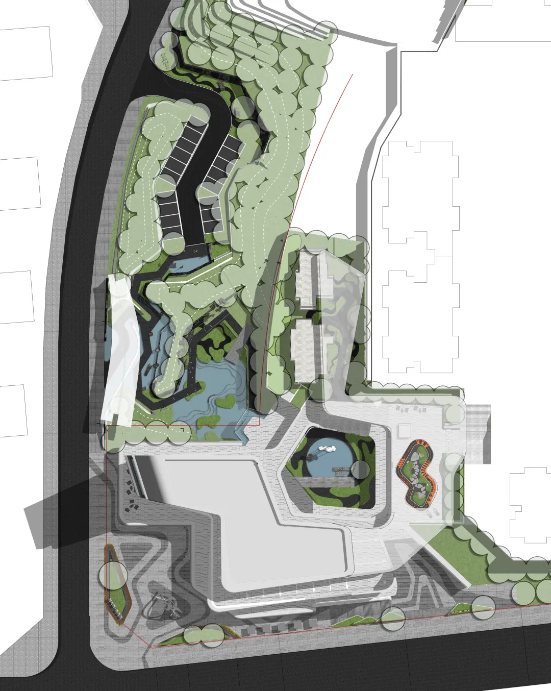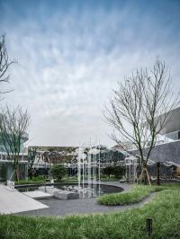 設計元素來自流動的水,整體鋪裝采用深色淺色的石材鋪貼出水一般的流線,在場地中央設置了一個互動性的水景噴泉,中心雕塑以數字符號∞(無窮大)為設計靈感象征未來生活的無限可能。外側設置點式樹池,對沿途市政車行道進行弱化。