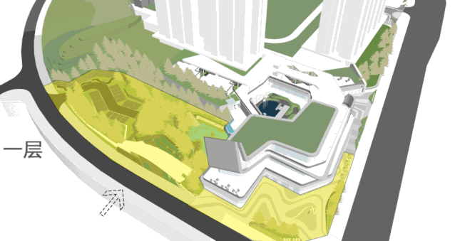 場地相鄰的兩條街雖相互交織,卻存在很大的高差,為讓場地臨街面都得以利用,園區(qū)外兩條街相交的拐角,規(guī)劃為商業(yè)廣場,設計主要以昭示性與活動性為主。