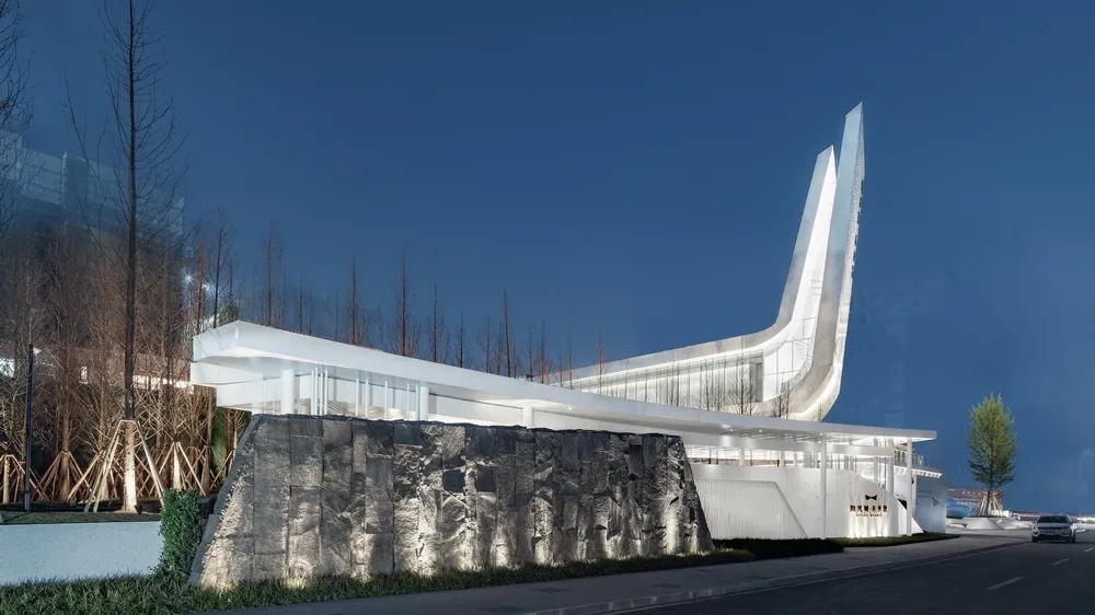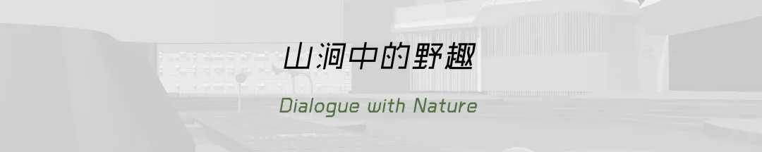 冬季的入口門樓,以起翹的曲面板打造輕盈流線與主體建筑產生呼應。立面上利用虛實結合的手法將粗礦的石頭與波浪形的半透格柵相結合。