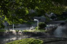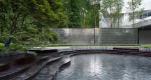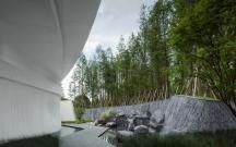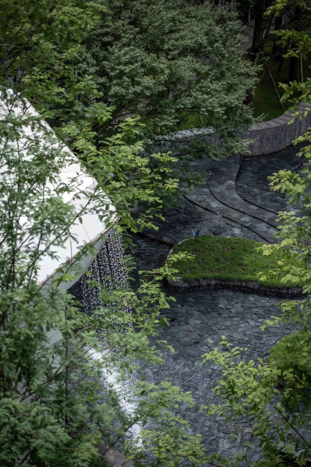 粗礦的石頭,平滑的白色墻面產生了神奇的化學反應,似乎要來一場自然與現代的碰撞,冬季的凌冽,夏季的蔥郁,交織著人們對于自然的渴望。一路蜿蜒的溪流將這自然與現代串聯,和著風,達成了一次和解。