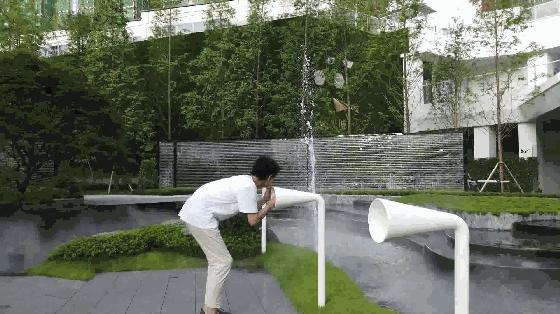 互動:聞聲噴泉,行人通過一個傳聲筒裝置利用聲波傳入池水下方,觸發(fā)噴泉,聲音越大噴泉越高。