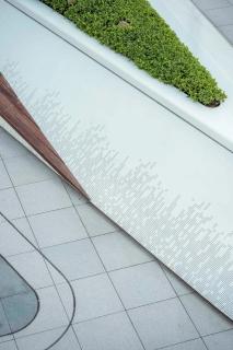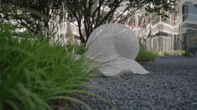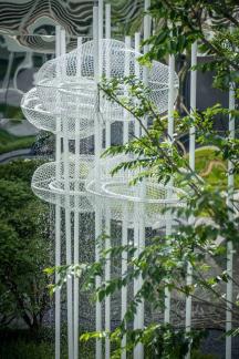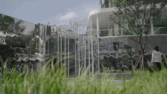 風動景墻在整體空間里起到一個分割作用,也是立面景觀視覺藝術性的呈現。1736塊隨風搖曳的小鱗片閃著微光,光滑的鏡面肌理將綠色、將天空、將花鳥統統映在心里。在風的作用下將孩子們玩耍的樣子來回搖擺。竟讓人分不清哪兒是夢境,哪兒又是現實。