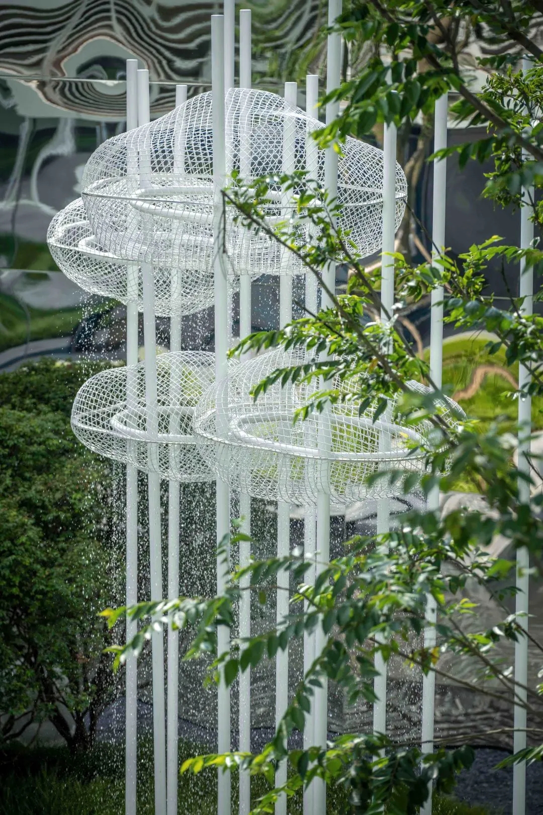 由于二層空間較小,又是圍合空間,設計需要從景觀層面將其空間弱化,并營造出藝術性與參與性。首先設計采用大面積鏡面景墻在視覺上增加空間體積,并沿建筑四周種植烏桕以弱化建筑立面。其次設置大面積鏡面水景,水景周邊做成圍合形綠島,在水景中間設置云朵型藝術化互動裝置。