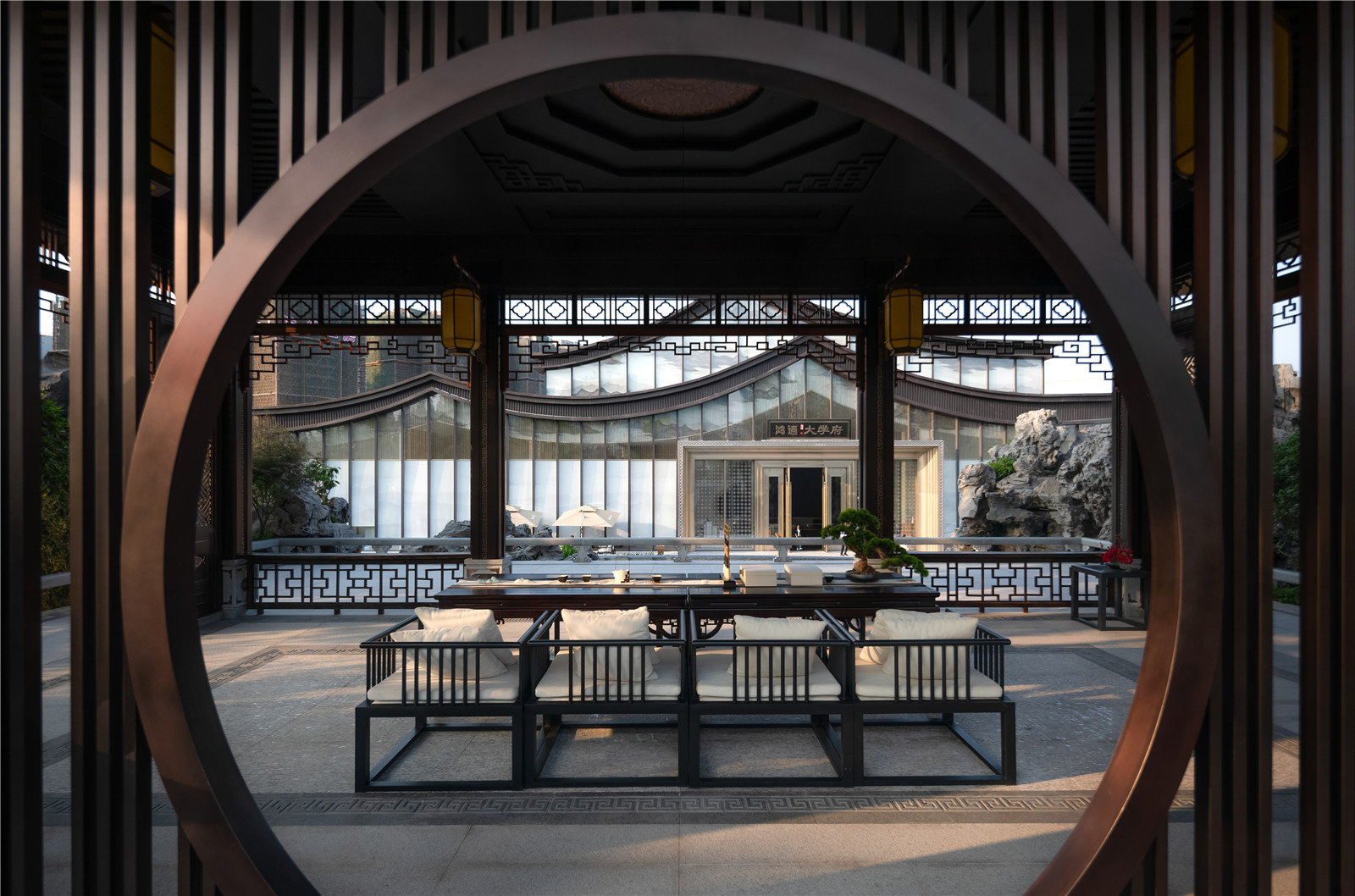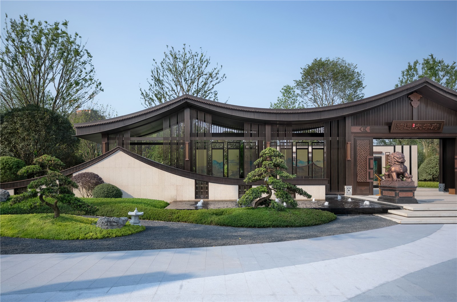 天驕書院為整個項目制高點,簡約的書院構(gòu)筑于太湖石堆疊的假山之上,南北雙向疊瀑,支撐整個項目的人文精神寄托。