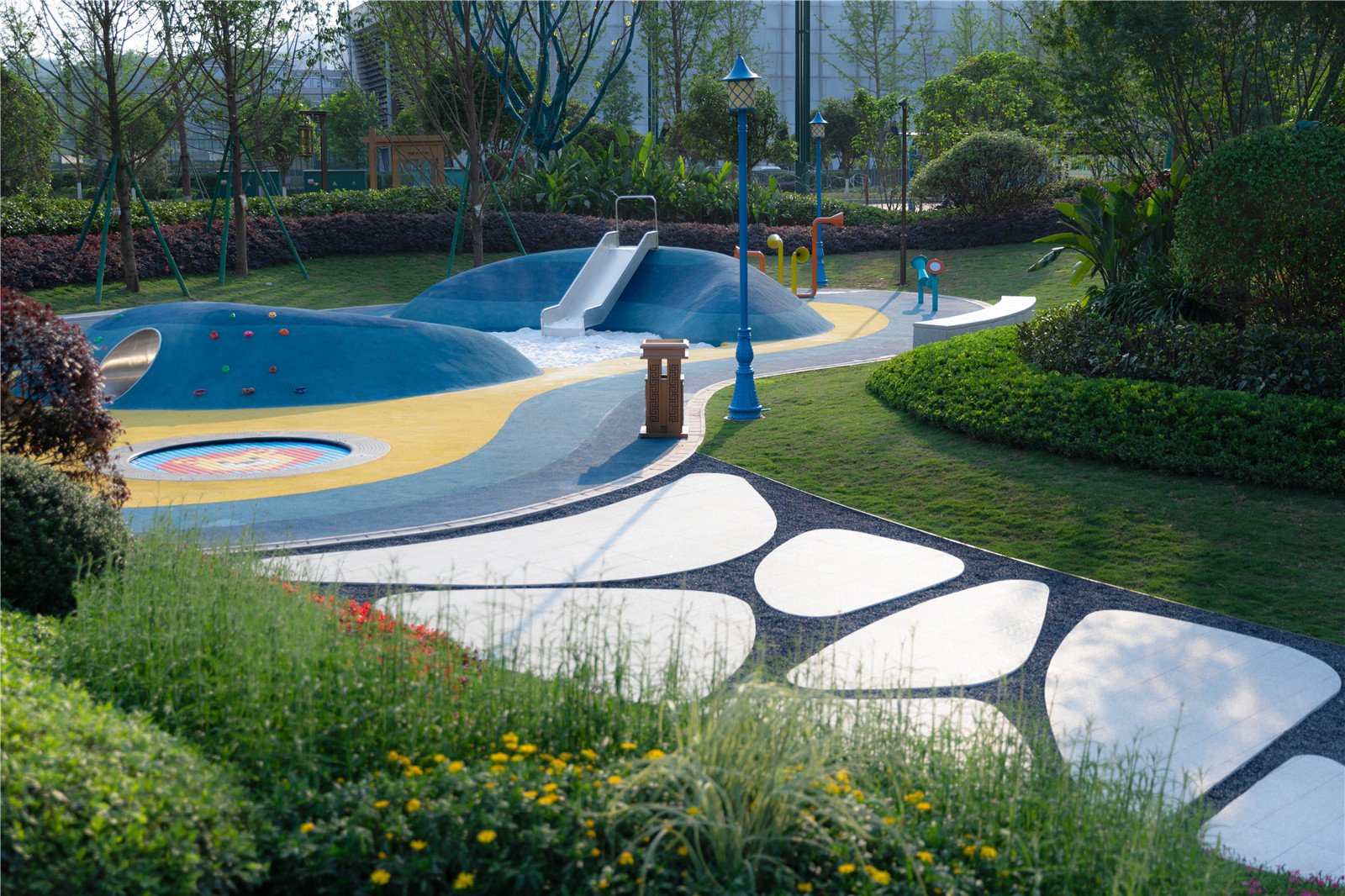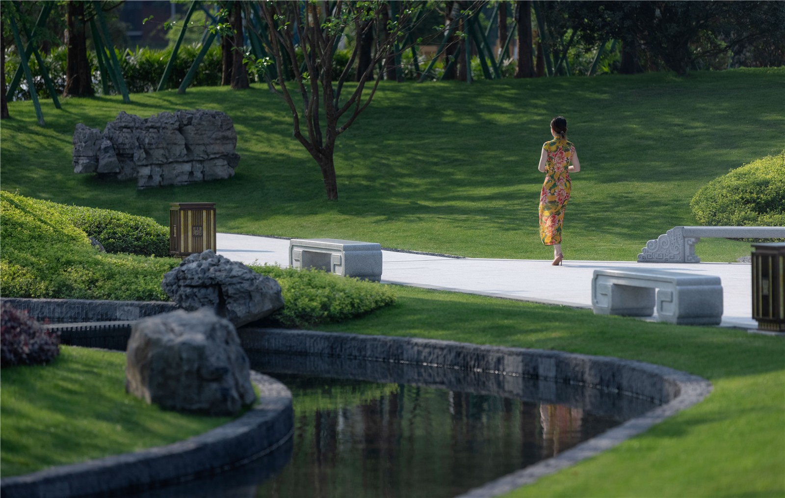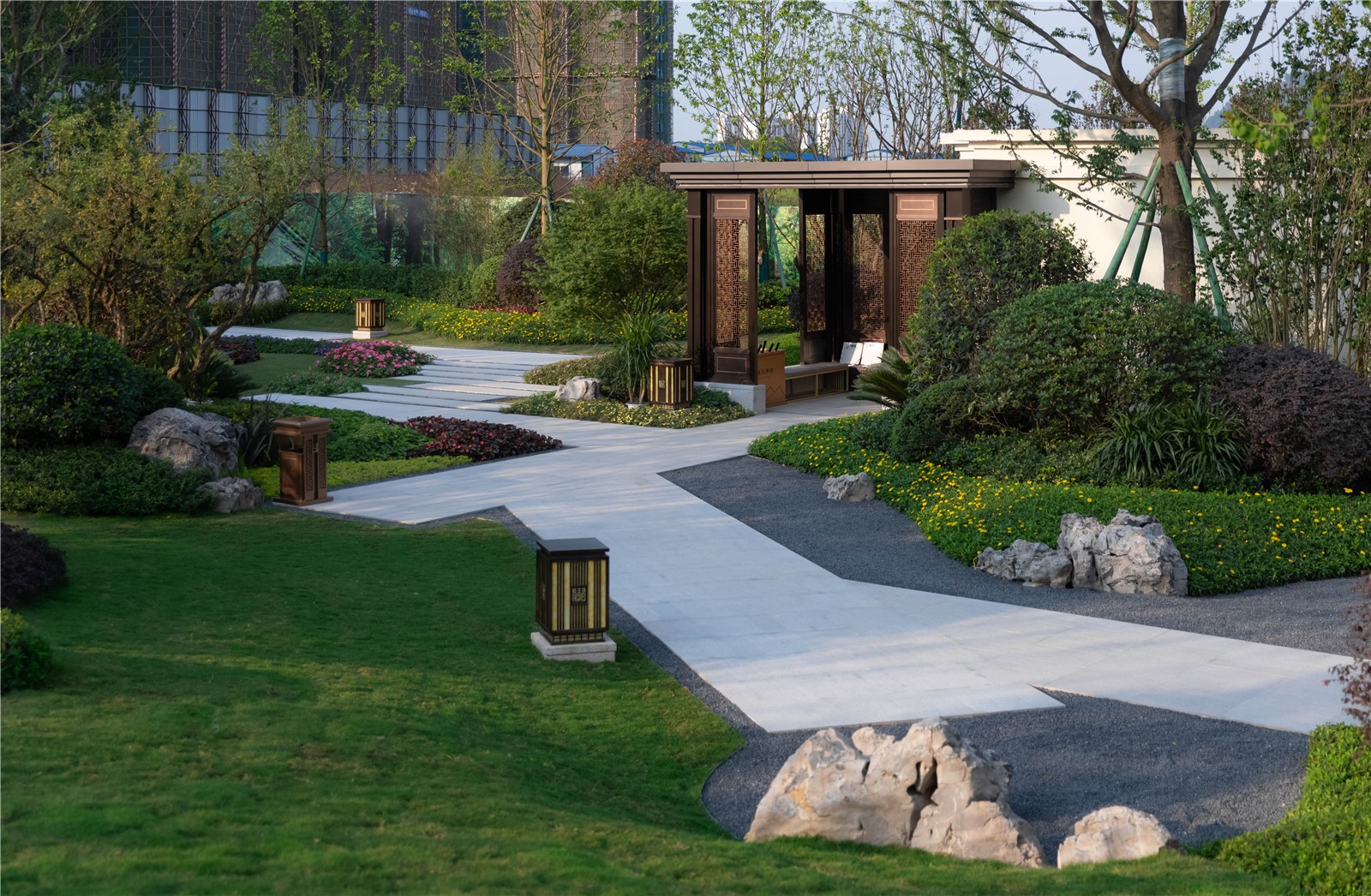 后場似傳統(tǒng)文人庭院,移步異景,用傳統(tǒng)造園手法,表現(xiàn)現(xiàn)代園林景觀。林徑與石嶼組織起每一個視線轉(zhuǎn)折,精巧雅致。