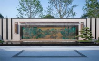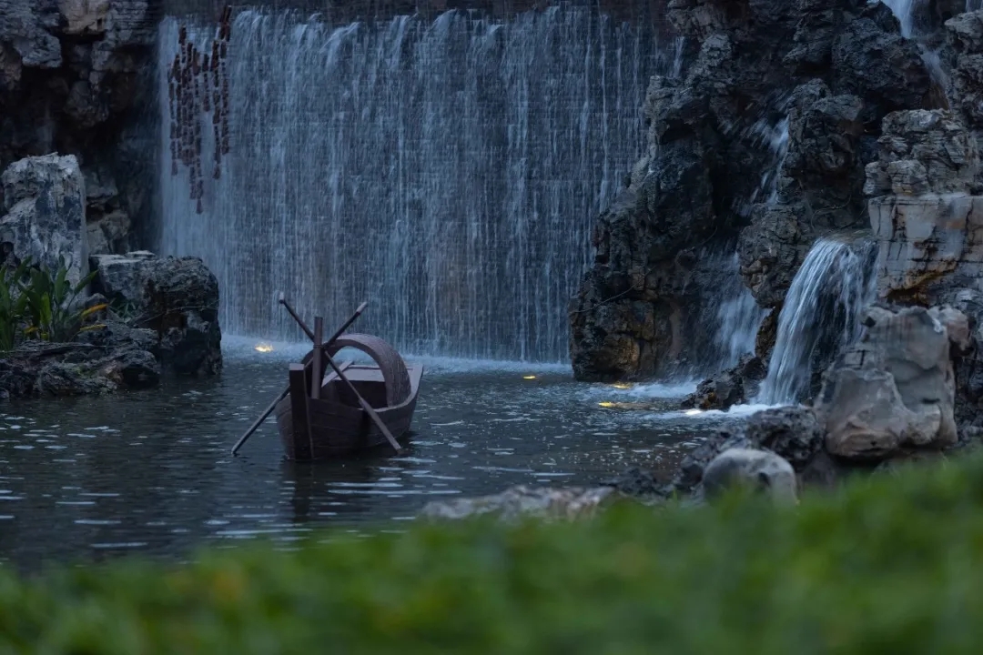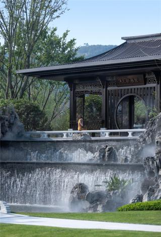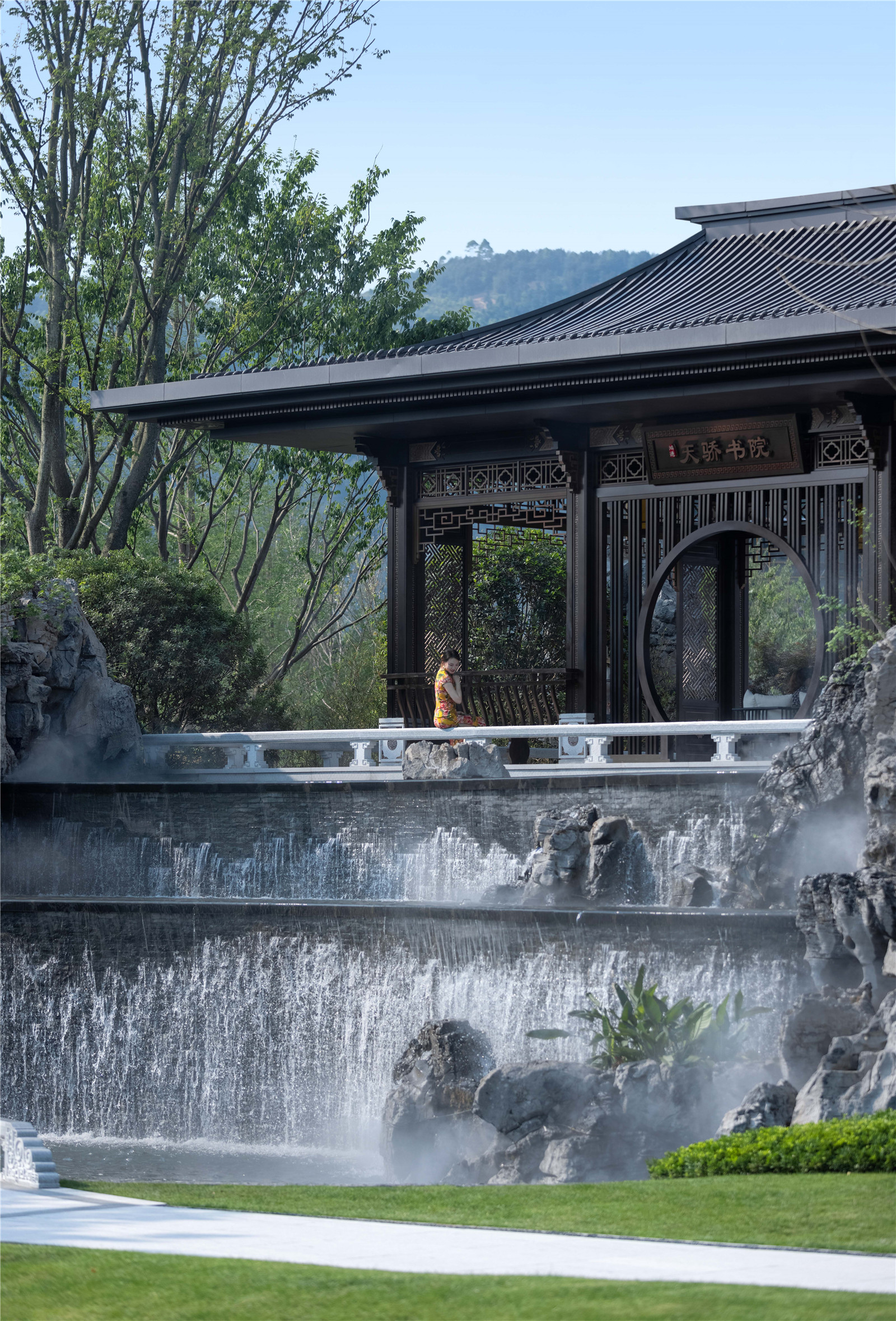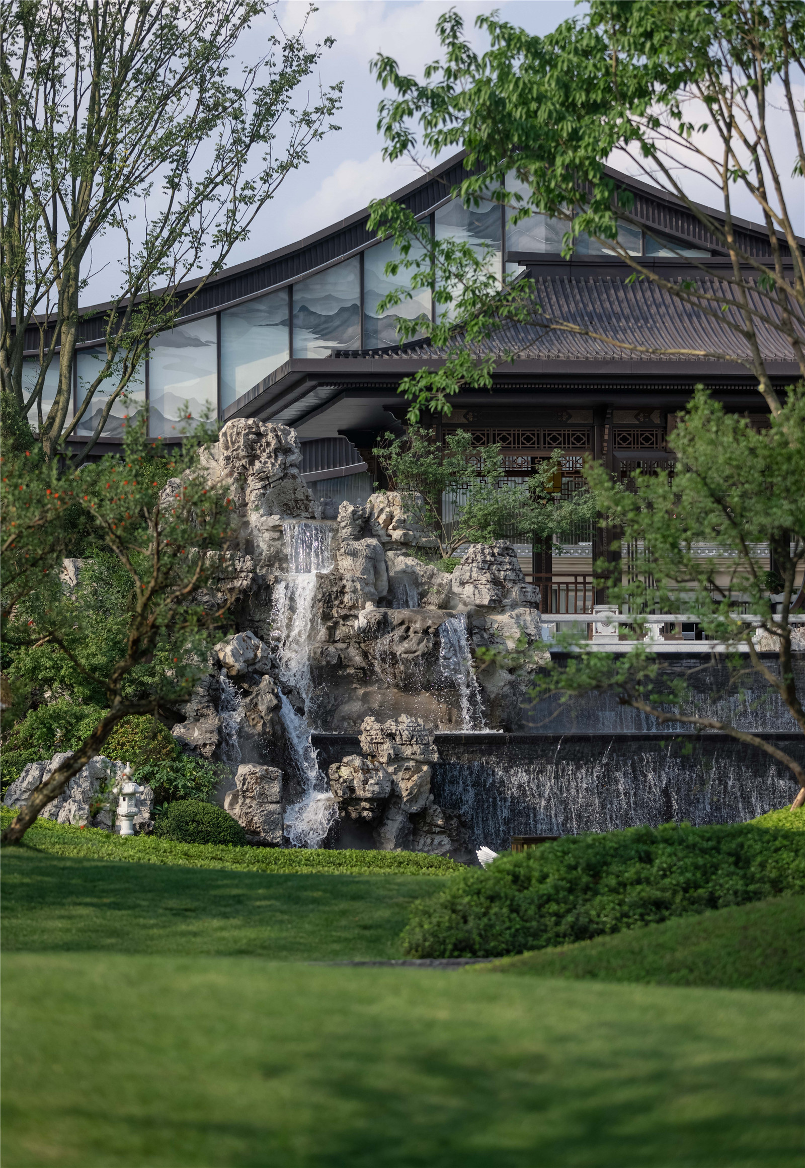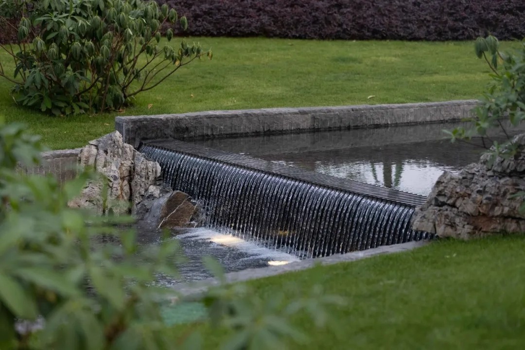 3m多高差形成氣勢磅礴瀑布,開闊的湖面襯托有著傳統(tǒng)屋面的現(xiàn)代建筑,繪山水于建筑立面上,園筑和諧,盡顯宋式山水意境。