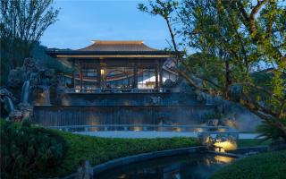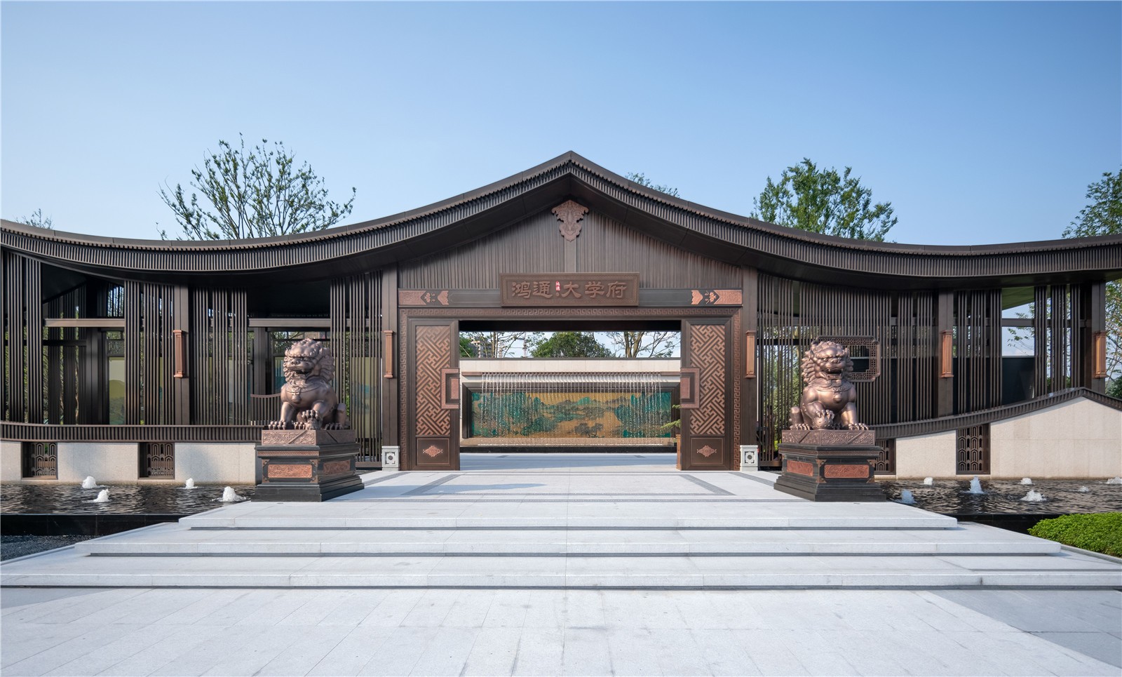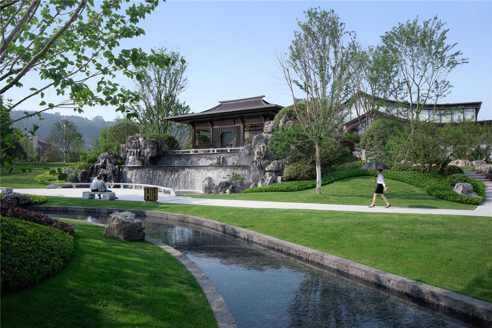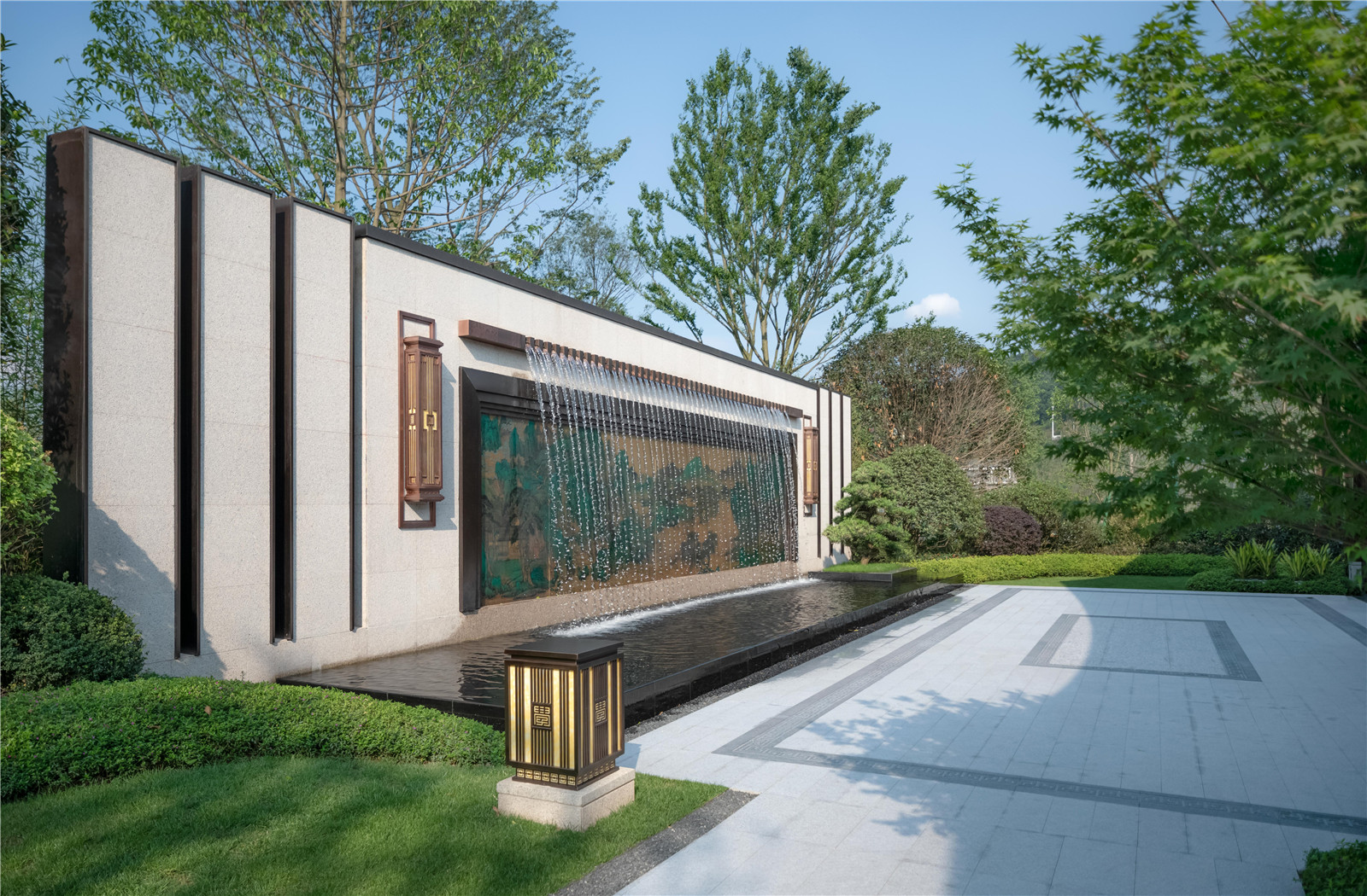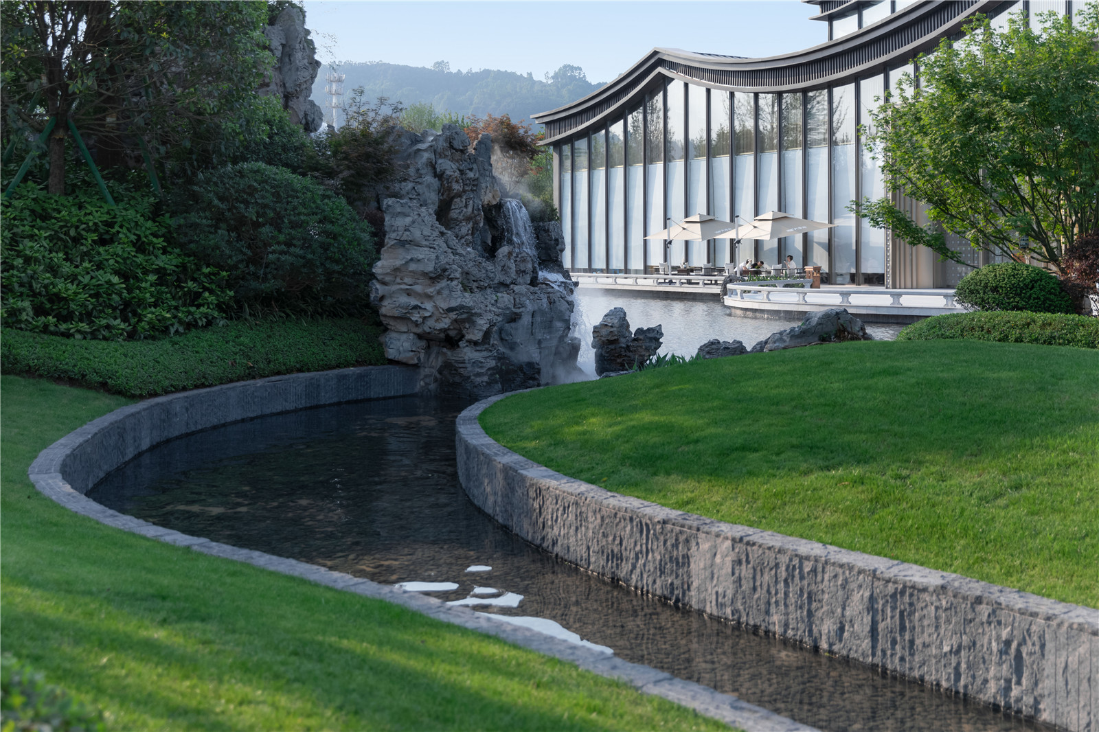 3m多高差形成氣勢磅礴瀑布,開闊的湖面襯托有著傳統(tǒng)屋面的現(xiàn)代建筑,繪山水于建筑立面上,園筑和諧,盡顯宋式山水意境。