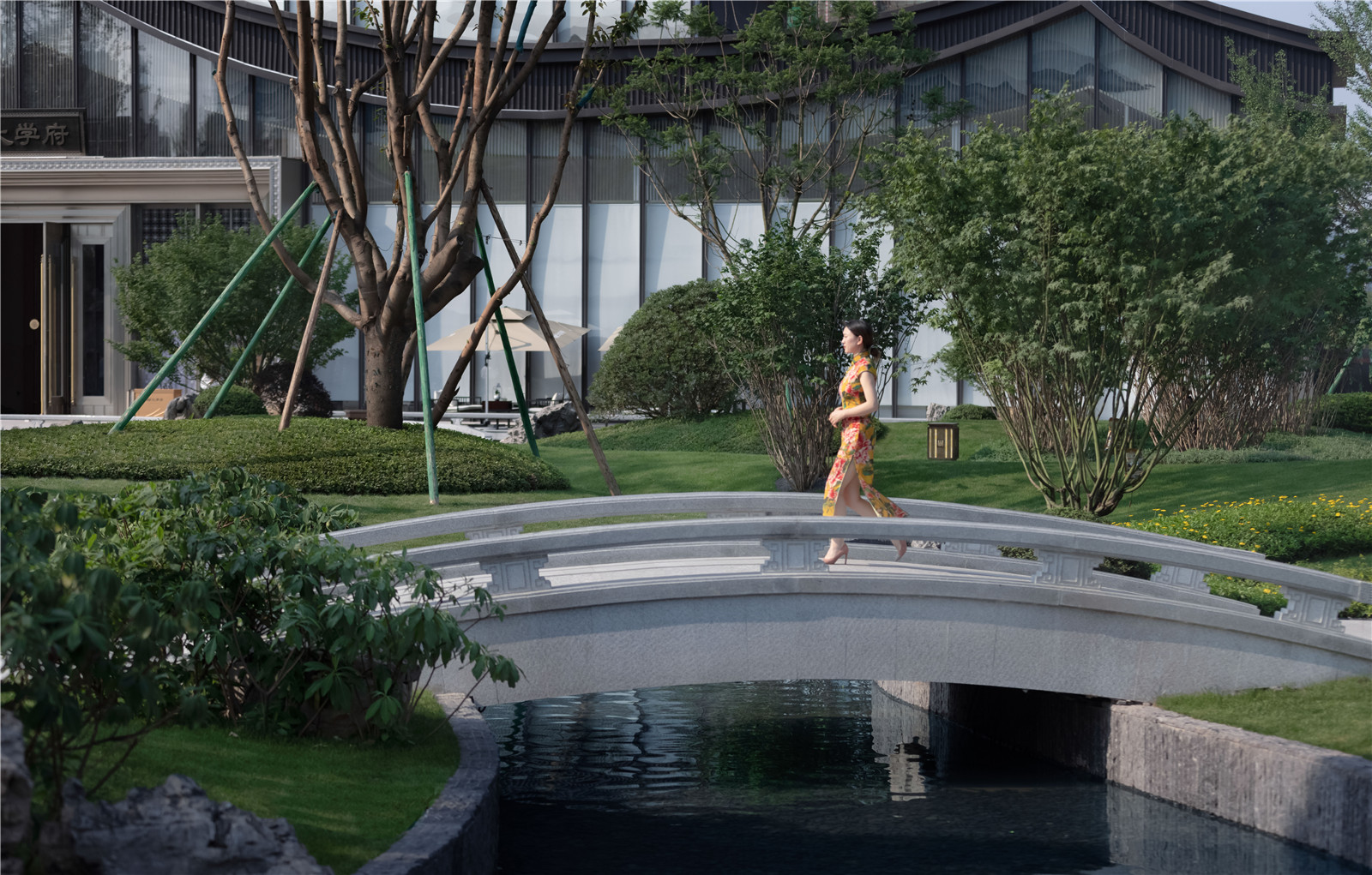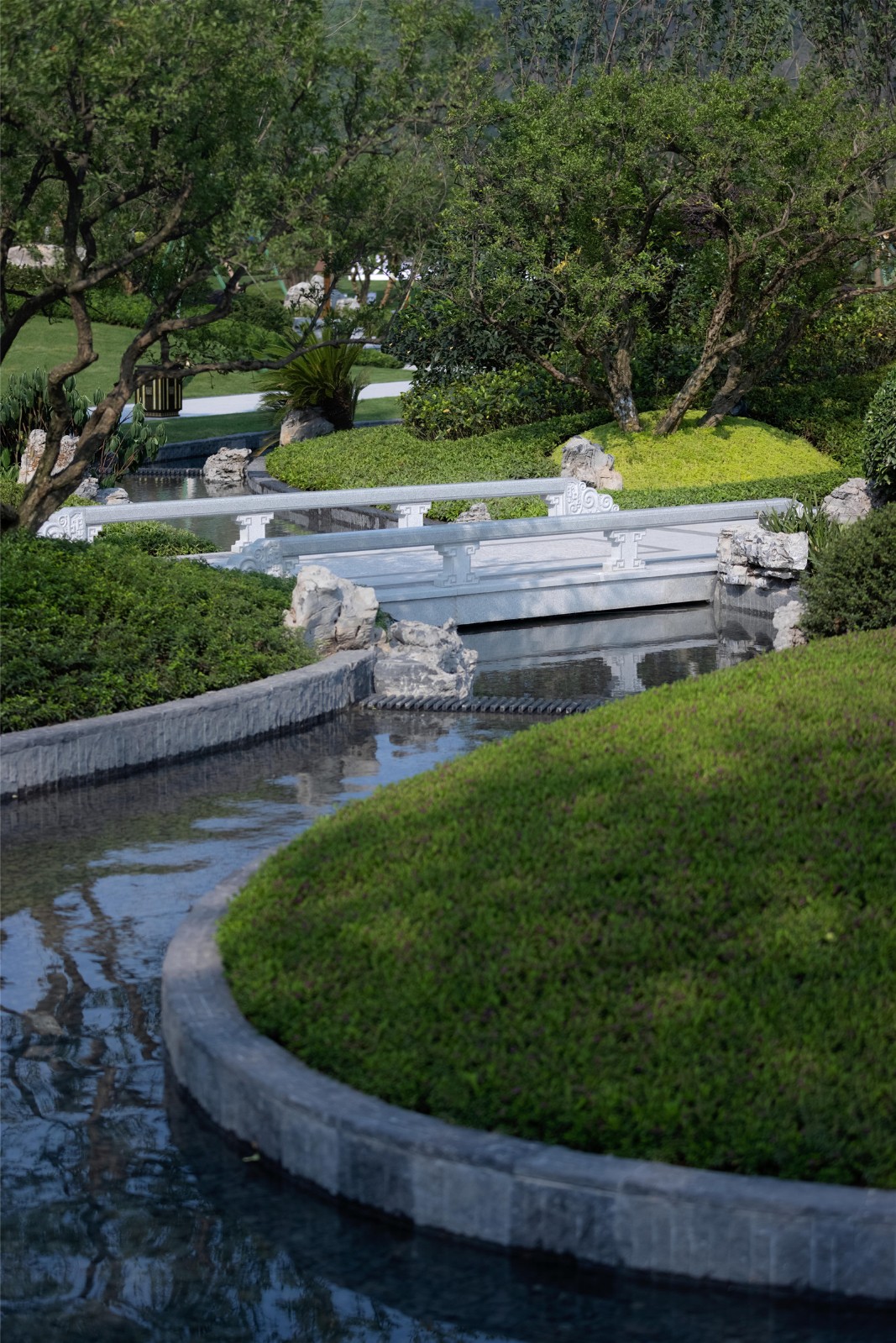 以境入情,“景以境界為最上”。由此,我們提出了三點策略:園中之筑、留白景觀、簡層植物,用景筑一體,天人和諧的宋式設(shè)計風格展現(xiàn)中國古典園林文化。