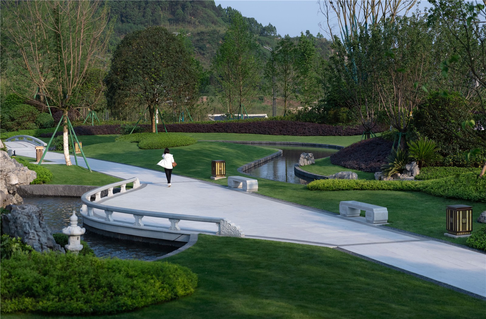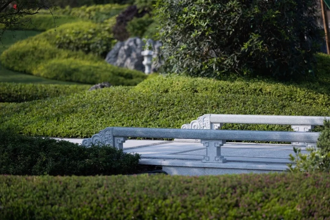 小溪和園路呈之字形串聯(lián)園區(qū),組織空間,豐富景致,路與水的關(guān)系時近時遠,兼有造型各異的園橋聯(lián)系。