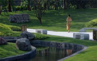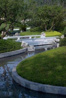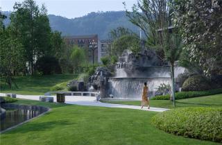 我們從中提煉出“飛流、疊瀑、秋林、書院、竹溪、行旅”六個符號成為景觀概念。以土石造山,層巒迭嶂,以水為媒,貫穿全園,將中國傳統(tǒng)的哲學(xué)審美及藝術(shù)語匯與當代的景觀和材料語言相結(jié)合,在地域性與當代性之間取得平衡。