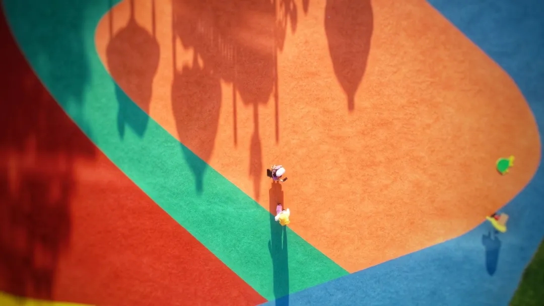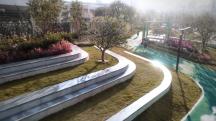 南區(qū)公園利用土方滿足的優(yōu)勢,規(guī)劃、配套全齡段的生活實踐,除了連通精神世界的綠色跑道,兒童場區(qū)的設(shè)計也在童真世界里延續(xù)了探索的樂趣,留有足夠的空間給孩子們?nèi)ソ涣?、去游戲、去治愈這個世界。
