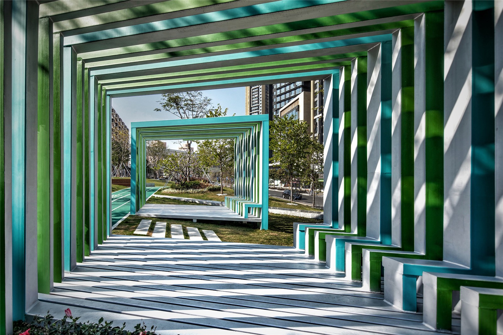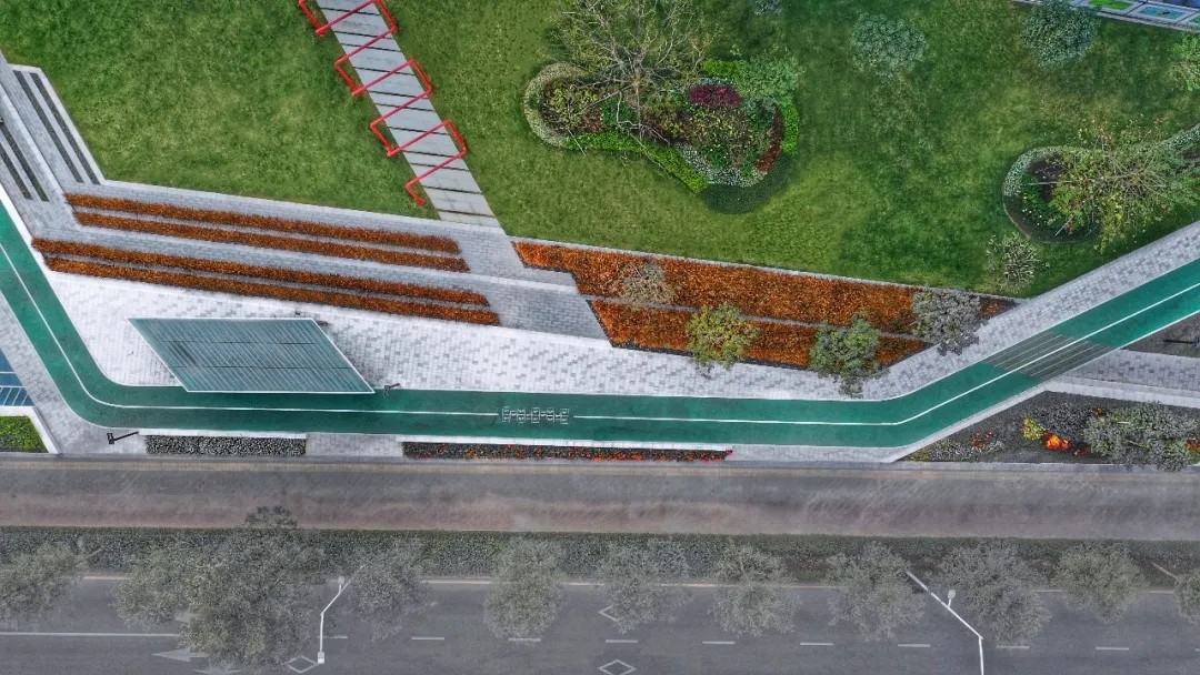 圖案變化,是人們不斷探索不同的生活方式的折射。在整條綠色跑道的設(shè)計中,SED設(shè)計團(tuán)隊還為公園確立了一套與跑道相統(tǒng)一的獨特幾何圖案,取源于人們?nèi)粘5纳顦啡ず妥匀凰募镜淖冞w,營造出富有層次的體驗,讓生活中不同時間、不同層次的畫面,都在同一地點印存。
