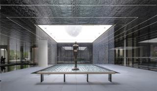 步入展示區(qū),通過(guò)空間收放組合,層層遞進(jìn),在“四水歸堂”的中式建筑格局基礎(chǔ)上,匠心傾造的“追光山景”,糅合了極具現(xiàn)代色彩的雕塑,誕生別具一格的現(xiàn)代東方美學(xué)。