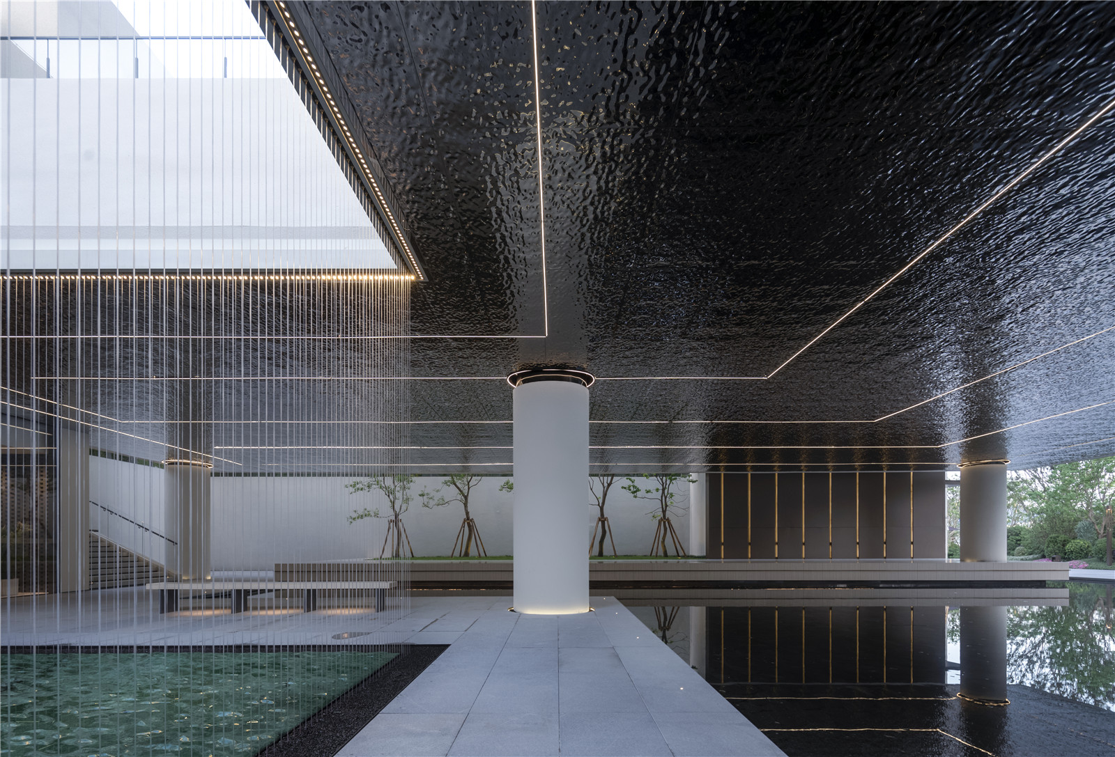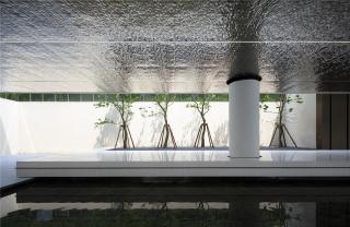 Above the water view, the shape of the ceiling is made of mirror finished stainless steel with water ripples. Echoing the water view on the ground, it endows the space with warmth and makes the entire environment softer.