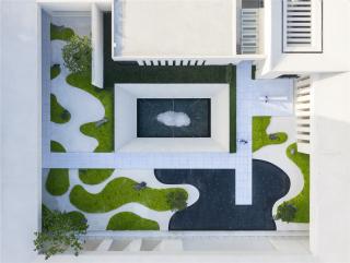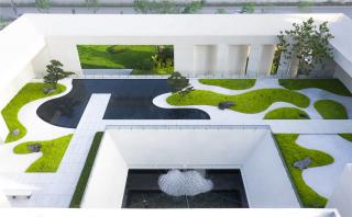 The space on the first floor creates a beautiful water view in an artistic context. The pond resembles a heart, on which ripples stir up a lively view. Reflected on the mirror-like surface are buildings, the courtyard, remote mountains, and daylight. Independent views inside and outside the space coexist and blend into a fascinating opposite view in the space.
