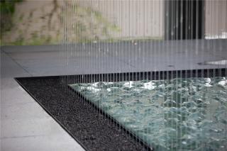 △跌瀑位置有較大高差,落水易受風(fēng)力吹散飄落,設(shè)置鋼絲網(wǎng),讓落水依附于鋼絲網(wǎng)順勢(shì)而下,形成均勻細(xì)膩的跌水效果,呈現(xiàn)出大跌瀑的視覺(jué)沖擊力的同時(shí),也體現(xiàn)了精致細(xì)膩的細(xì)節(jié)處理。Given the waterfall’s height difference, falling water is likely to be blown hither and thither by the wind. Hence a stainless steel wire mesh is set, allowing the water to flow downward evenly. Not only does it present the visual impact of large waterfalls, but also it shows the meticulous processing of fine details.