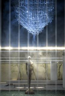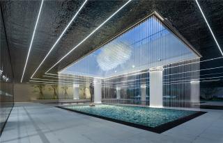 在本次景觀設(shè)計(jì)中,設(shè)計(jì)師將這份美好寓意在場(chǎng)地延續(xù),讓居者找到歸屬感和幸福感。選用光纖水簾環(huán)繞在中庭外圍,彷如瀑布傾瀉而下一般,夢(mèng)幻的動(dòng)態(tài)效果,讓景觀整體更具“自然”特性。庭院內(nèi)打造了大面積的“永恒之水”,栩栩如生的表現(xiàn)出水的光澤和流動(dòng)感?!白饭馍骄啊钡脑O(shè)計(jì),融合了傳統(tǒng)與創(chuàng)新,用藝術(shù)與科技共同演繹人文自然的藝術(shù)之作。