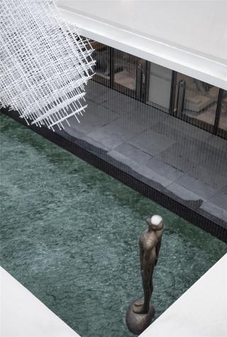 首層空間以藝術(shù)語(yǔ)境構(gòu)筑優(yōu)美水景,一池一心境,一波一漣漪,生動(dòng)活潑。鏡面水景微瀾的水面倒影著建筑、庭院、遠(yuǎn)山、天光,讓空間內(nèi)外彼此獨(dú)立的景致得以共生交融,形成有趣的空間對(duì)景。