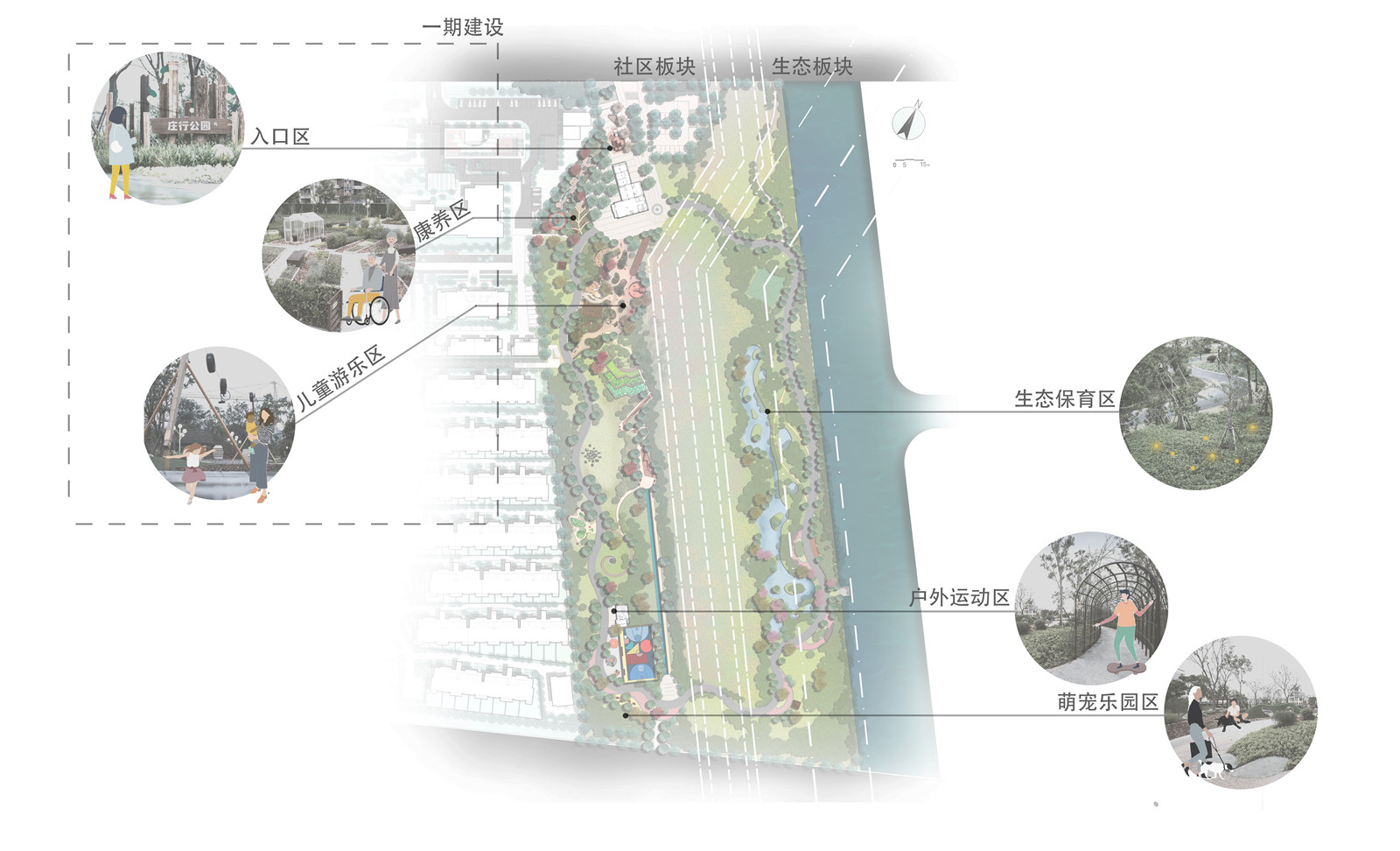現(xiàn)有場(chǎng)地是由垃圾填埋場(chǎng)改造而來(lái),場(chǎng)地上方有高壓線、地下埋了液化油管,對(duì)人群活動(dòng)與景觀種植都起到了一定的限制。基于這樣的情況,設(shè)計(jì)中將場(chǎng)地東側(cè)設(shè)置為以生態(tài)保育為主的生態(tài)板塊,而主要的人群活動(dòng)放在場(chǎng)地西側(cè)的社區(qū)板塊。整體考慮周邊居住區(qū)、社區(qū)養(yǎng)老院的適用人群需求,綜合考量全齡段日?;顒?dòng),將社區(qū)板塊分為了康養(yǎng)區(qū)/親子游樂(lè)區(qū)/戶外運(yùn)動(dòng)區(qū)/萌寵樂(lè)園幾大分區(qū)。本次一期工程重點(diǎn)打造以鄉(xiāng)土明星物種螢火蟲(chóng)為主題的親子游樂(lè)區(qū),和激發(fā)老人社會(huì)歸屬感及心理健康為出發(fā)點(diǎn)的康養(yǎng)區(qū)。