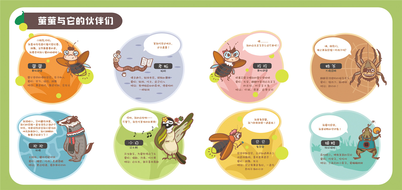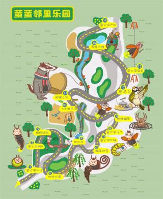 親子游樂(lè)區(qū)以鄉(xiāng)土明星物種螢火蟲(chóng)——黃脈翅螢為主題,以黃脈翅螢的卵、幼蟲(chóng)、蛹到成蟲(chóng)的四變態(tài)過(guò)程為主線,串聯(lián)螢火蟲(chóng)作為傘護(hù)種在自然環(huán)境里遇到的蚯蚓、大腹園蛛、狗獾、白頭鵯、條背螢、飾紋姬蛙等各位“鄰居”。在整體的景觀敘事中,將自然物種擬人化,并提煉其“鄰居”們的生境元素,通過(guò)空間設(shè)計(jì)的手法將其轉(zhuǎn)化為有趣、互動(dòng)性強(qiáng)的景觀節(jié)點(diǎn)。此外,結(jié)合景觀設(shè)計(jì)制作了一系列科普標(biāo)示、導(dǎo)覽手冊(cè)、生境手冊(cè)以及引導(dǎo)親子參與互動(dòng)的系列活動(dòng)。希望通過(guò)這些內(nèi)容引導(dǎo)社區(qū)公園使用者(尤其是兒童)關(guān)注身邊的自然,了解生境的重要性,并在社區(qū)活動(dòng)中促進(jìn)人與人、人與自然的鏈接。