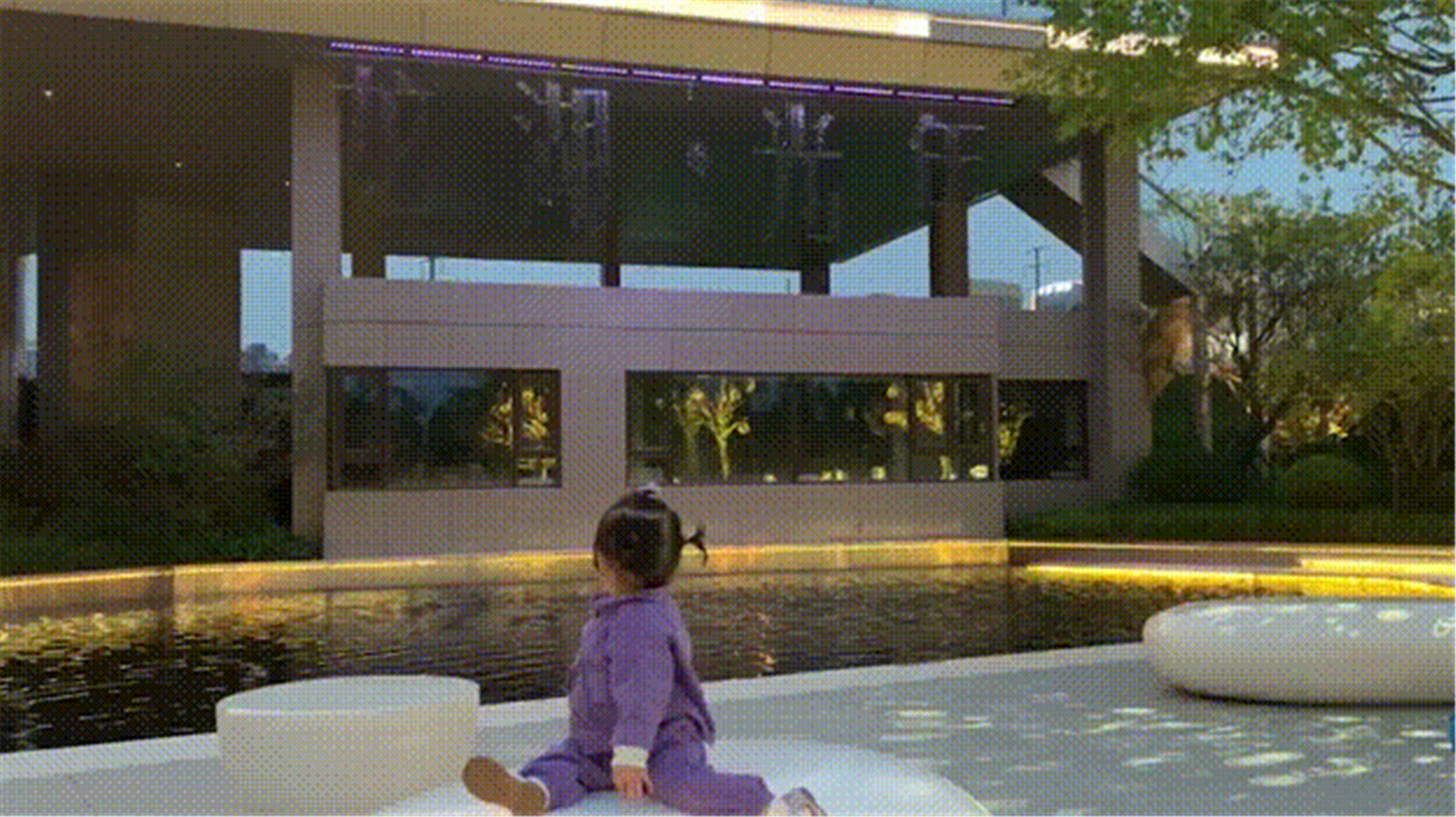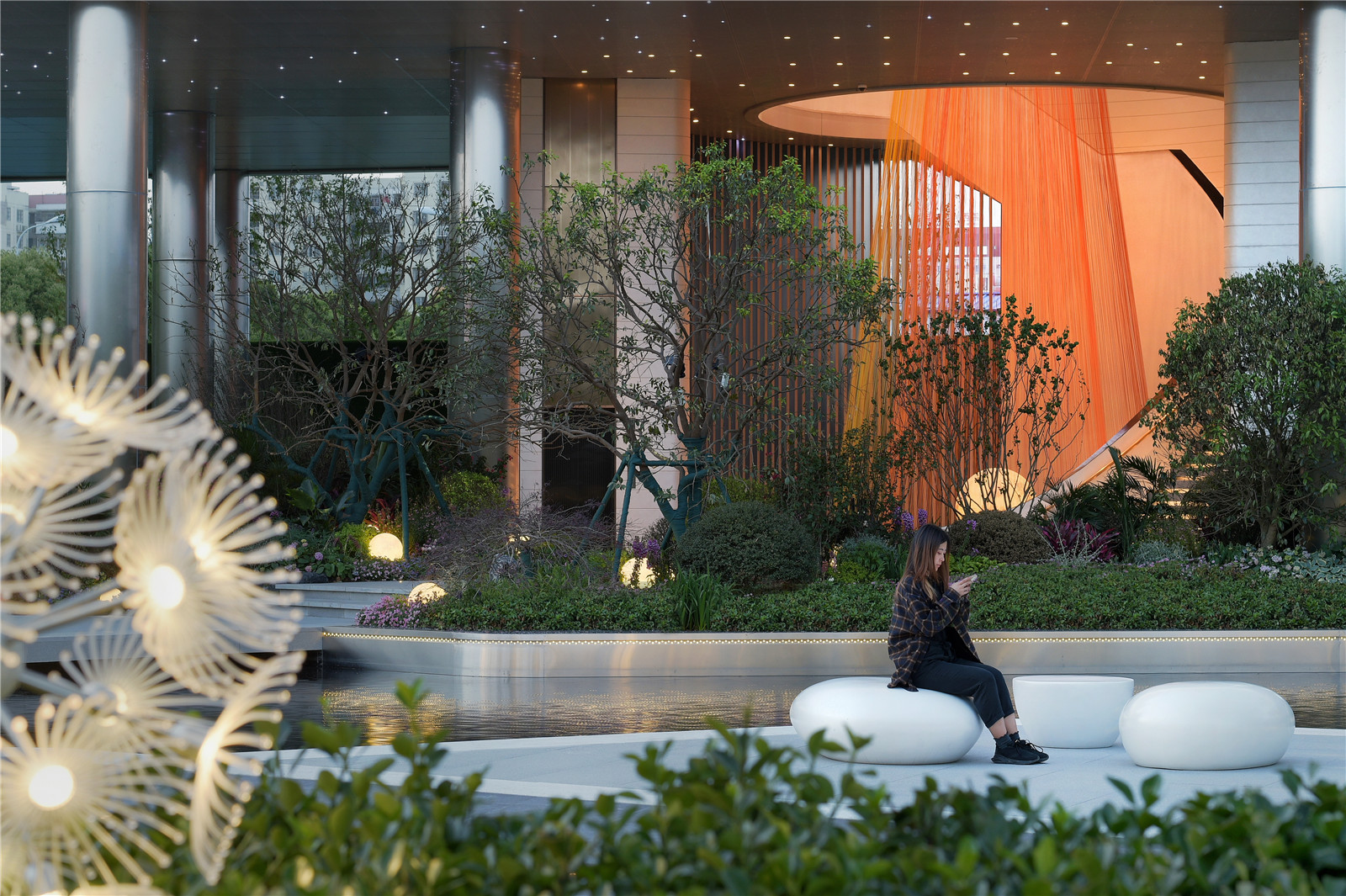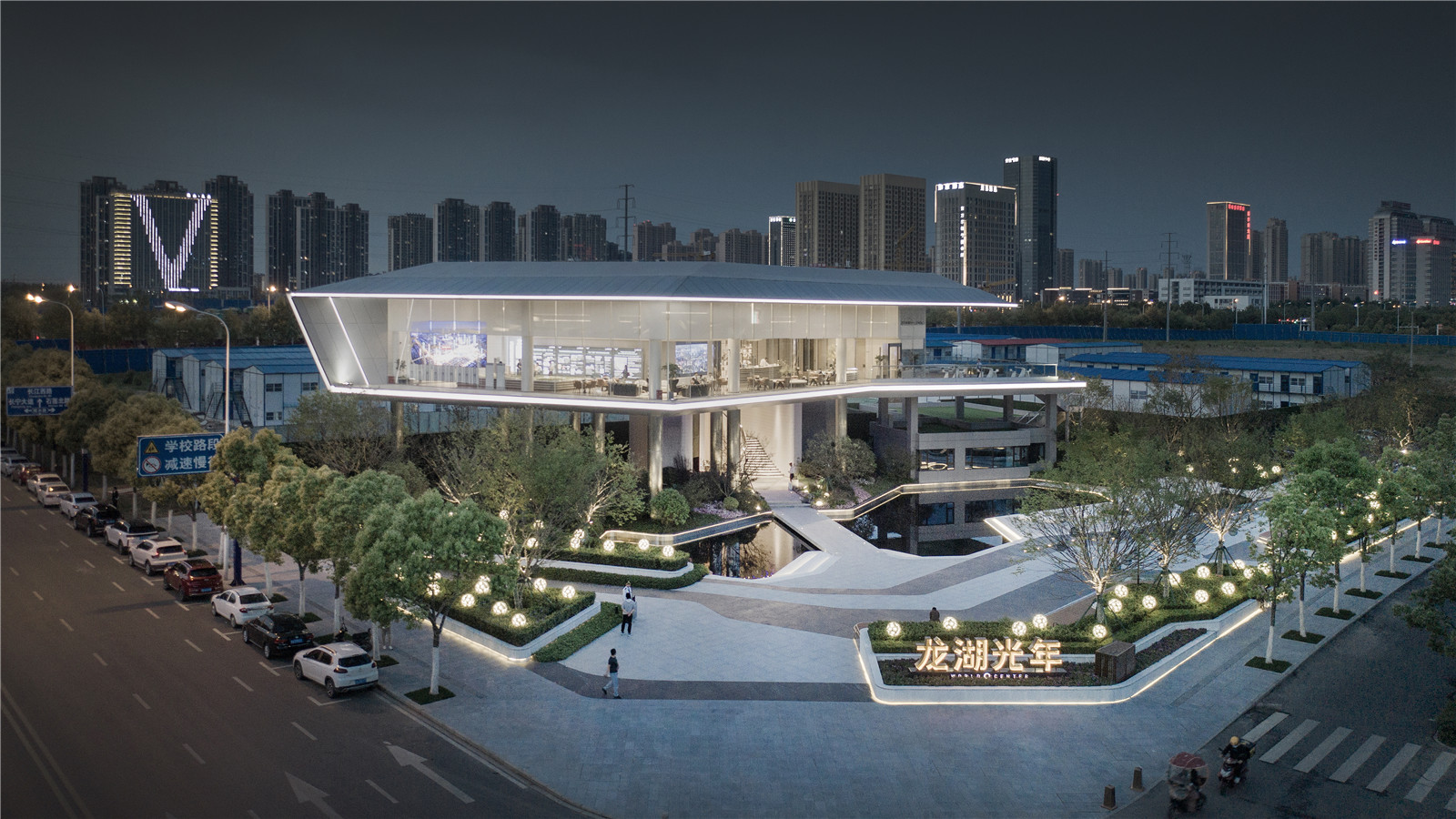 龍湖光年的光影LOGO佇立為景觀墻,隔絕開外界喧鬧的環(huán)境,