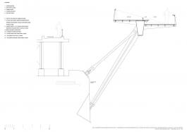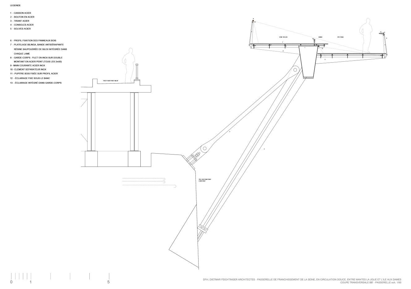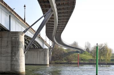 In the middle of the river, the two concrete pillars of the Pont Neuf serve to carry the intermediate supports. Thus, the new structure does not encroach on the riverbed. In each case, an inclined cross-sectional leg, fixed to the stem of the pier, takes up the vertical force, while a connecting rod ensures the stability of the entire structure. These connecting rods, embedded in the caisson, are articulated at the head of the pillars. The variable profile of the brackets makes it possible to support decks of varying widths and to absorb the differences in elevation of the decking between the two-wheeler path on the bridge side and the pedestrian path on the river side.