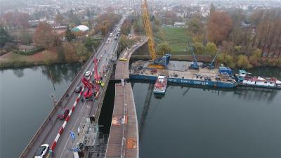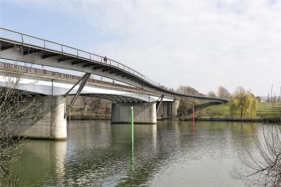 Almost imperceptible when one approaches the town from the riverbanks, the first crossing is based on an existing structure, the Pont Neuf, built in the 18th century following the destruction of the ramparts protecting Mantes. The relatively narrow structure was rebuilt after the Second World War and spans the Quai des Cordeliers at the continuation of the Rue Royale and opens up the town to the north. As it is now saturated with permanent road traffic, it is no longer appropriate for pedestrians and cyclists to cross the river.