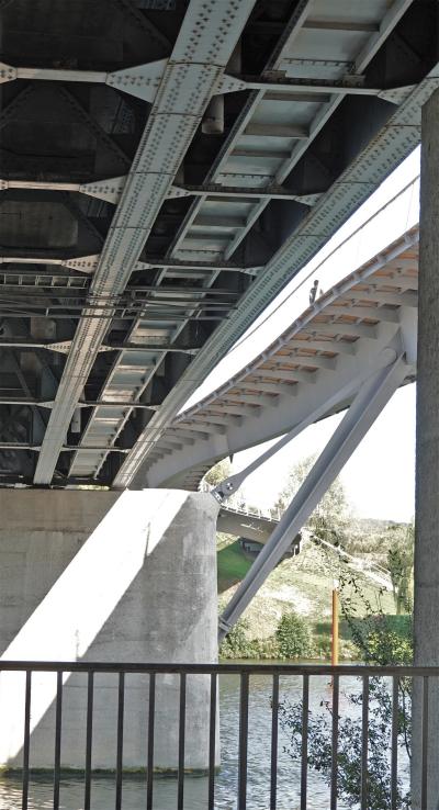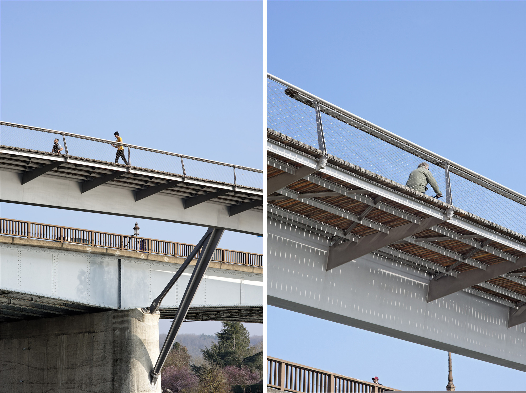 For this first crossing, which is now completed and runs alongside the road bridge, Dietmar Feichtinger chose to place the new structure at a distance from the existing bridge deck. When you stand on the bank, the footbridge looks as if it is flying over the river: fine steel curves undulate between the two banks in a three-dimensional motion, continually changing shape, rising and almost imperceptibly separating the pedestrian path from that of the two-wheelers, which is positioned closer to the car bridge. Whether crossing on foot or by bike, one almost immediately forgets the noise of the traffic. A difference in level is established between the decking of the two routes to form a bench seat. In the middle of the crossing, where the footbridge rises well above the roadway, the levels meet and the passage widens to offer passers-by a view over the river where they can linger to admire the beautiful landscape.