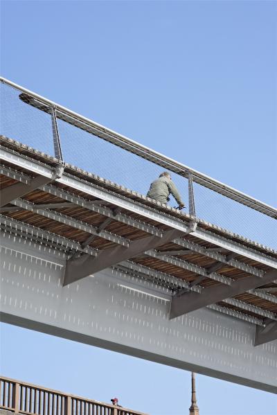 步行橋在已有的車(chē)行橋一側(cè)蜿蜒并行,始終保持一定距離。從河岸望去,步行橋宛如飛旋于塞納河上,精細(xì)的鋼制曲線在兩岸之間起伏騰挪,形態(tài)不斷發(fā)生變化,在不知不覺(jué)中人行道與自行車(chē)道通過(guò)高差相互隔開(kāi),其中自行車(chē)道更靠近一旁的車(chē)行橋。無(wú)論是步行還是騎自行車(chē),人們幾乎感受不到汽車(chē)駛過(guò)的喧囂。兩條道路之間的高差可作為長(zhǎng)椅供人們休憩。橋的中部略高于車(chē)行橋,人行道和自行車(chē)道間在這里沒(méi)有高差,從而使橋面變寬,行人可以在此慢慢欣賞塞納河美麗的風(fēng)景。