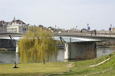 從河岸向北部的城鎮(zhèn)走去,人們很難察覺(jué)到步行橋建立在原有的橋梁——“新橋”的結(jié)構(gòu)上。它始建于18世紀(jì)Mantes-la-Joie的城墻被拆除之際,第二次世界大戰(zhàn)后又重建了如今較窄的部分,并擴(kuò)展了皇家大道(Rue Royale)延長(zhǎng)線上的Cordeliers碼頭,讓小鎮(zhèn)向北部開(kāi)放。但如今,橋上來(lái)往的車(chē)輛擠壓了步行與騎行的的空間。