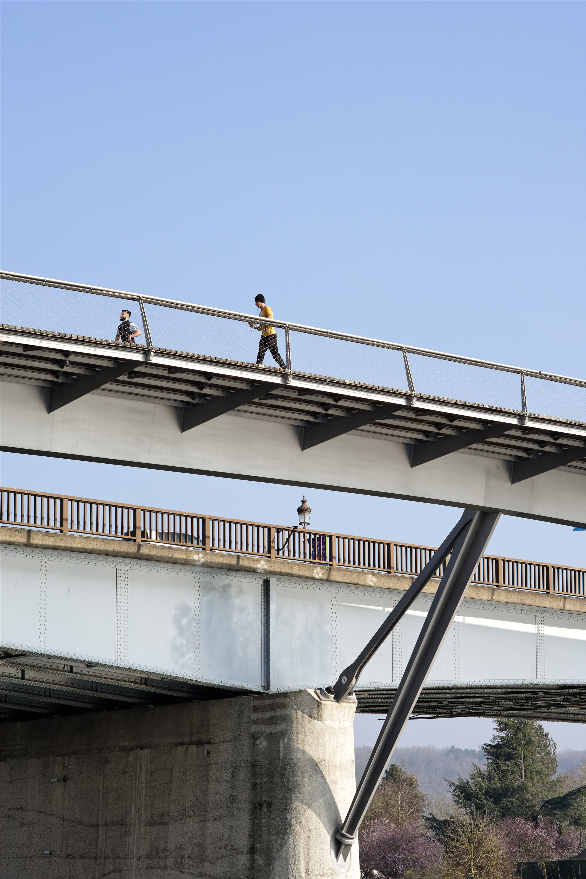 1940年,這座歷史悠久的橋梁中間的兩個(gè)橋拱被潰敗的法國(guó)軍隊(duì)炸毀。這道斷裂的傷痕將被設(shè)計(jì)師精密地縫合起來(lái),在3 根細(xì)長(zhǎng)橢圓形橫梁組成的精鋼框架上,架設(shè)著鋼柱、玻璃護(hù)欄和木質(zhì)橋面。扁平的鋼制護(hù)欄讓步行橋顯得輕盈而線性,與石材的厚重和曲線形成鮮明對(duì)比。老橋的最后一個(gè)拱門(mén)標(biāo)示著步行橋的結(jié)束,上岸后人們將經(jīng)過(guò)名為Maison du Passeur的前海關(guān)大樓與其綠樹(shù)成蔭的三角形廣場(chǎng)。這個(gè)位于Limay老城入口的公共廣場(chǎng),將因?yàn)樾腥撕万T自行車(chē)的人紛至沓來(lái)而變得充滿生機(jī)。