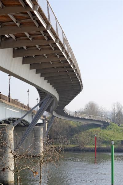 步行橋位于法國(guó)Vexin地區(qū)南部邊界的塞納河彎道上,成為城市與自然景觀交織的舞臺(tái)。在河谷坡地茂密的樹(shù)蔭之下,在圣母教堂高聳的尖頂和北岸古城的街道之間,人們沿著步行橋穿越塞納河的兩條分支,在河中小島Ile aux Dames的繁茂坡地上肆意徜徉。