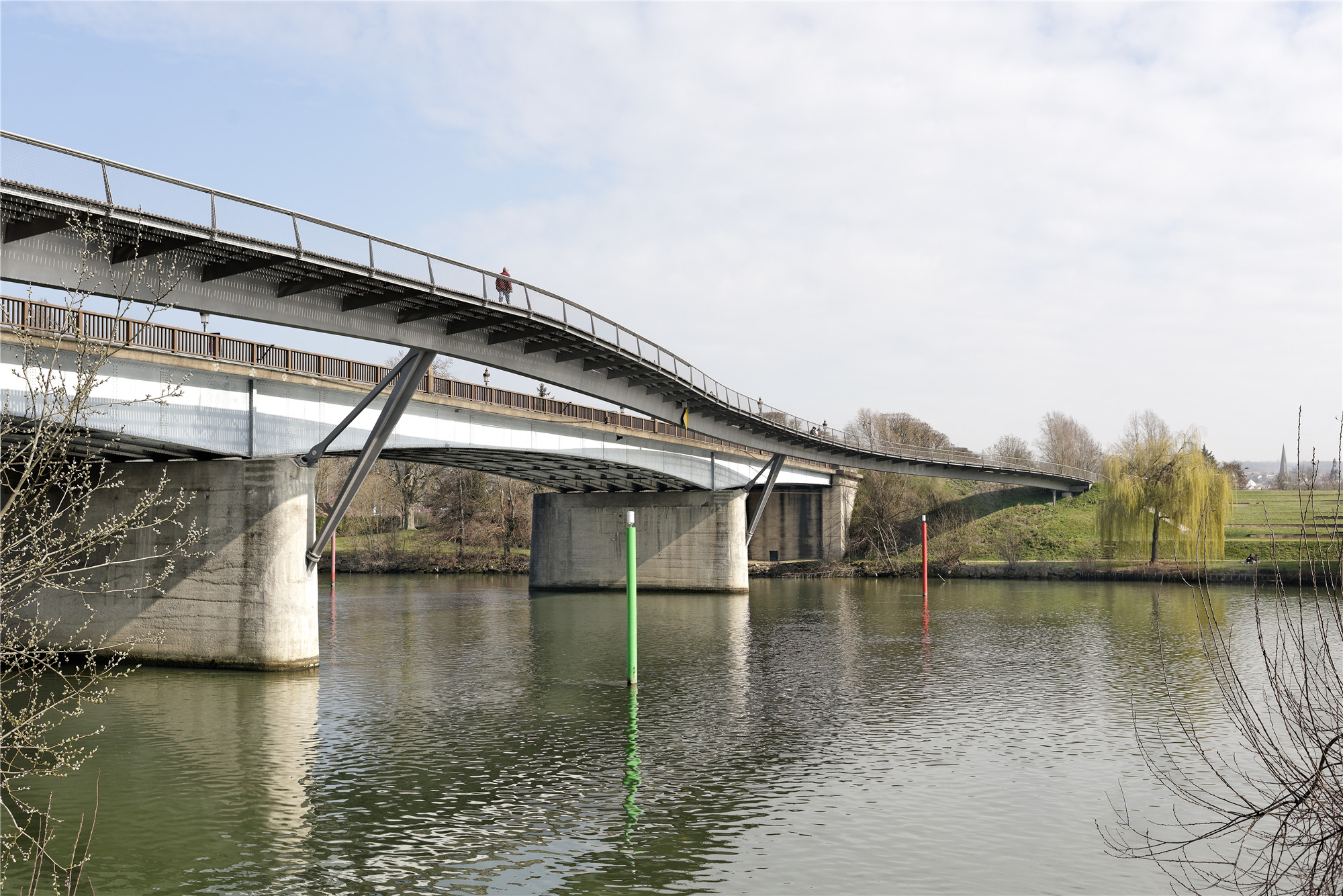 Dietmar Feichtinger enjoys diverting, softening and twisting his structures, as he did in Paris with the Simone de Beauvoir footbridge; he never passes up an opportunity to twist the wise rules of traditional construction. Beneath the buttresses of the collegiate church, he casts a double ribbon of steel and wood which brushes against, rises above, gets closer to and then moves away again from the road. The all-steel structure is supported by the bridge abutments on either side of the river. A central caisson with a variable trapezoidal profile forms the main framework, like a spinal column to which a series of T-shaped brackets are fixed 3 meters apart from one another. The watertight box girder is composed of welded metal sheets whose torsional strength enables the asymmetrical forces generated by the profile of the bridge to be transferred to the supports.