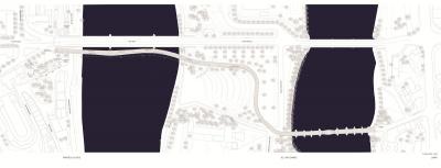 在河中的島上,橋面緩緩向外延伸并降低高度,像樓廳一樣環(huán)繞著露天劇院,同時(shí)將圣母教堂引入人們的視野。連接小島與Limay的舊橋(Vieux Pont)修復(fù)完成后,步行橋?qū)⑷嫱度胧褂?。步行橋北段將伴隨著這些柯羅曾在1869年作品“塞納河上Limay的舊橋”中描繪過(guò)的金色橋拱,連接河流兩側(cè)繁茂的森林。