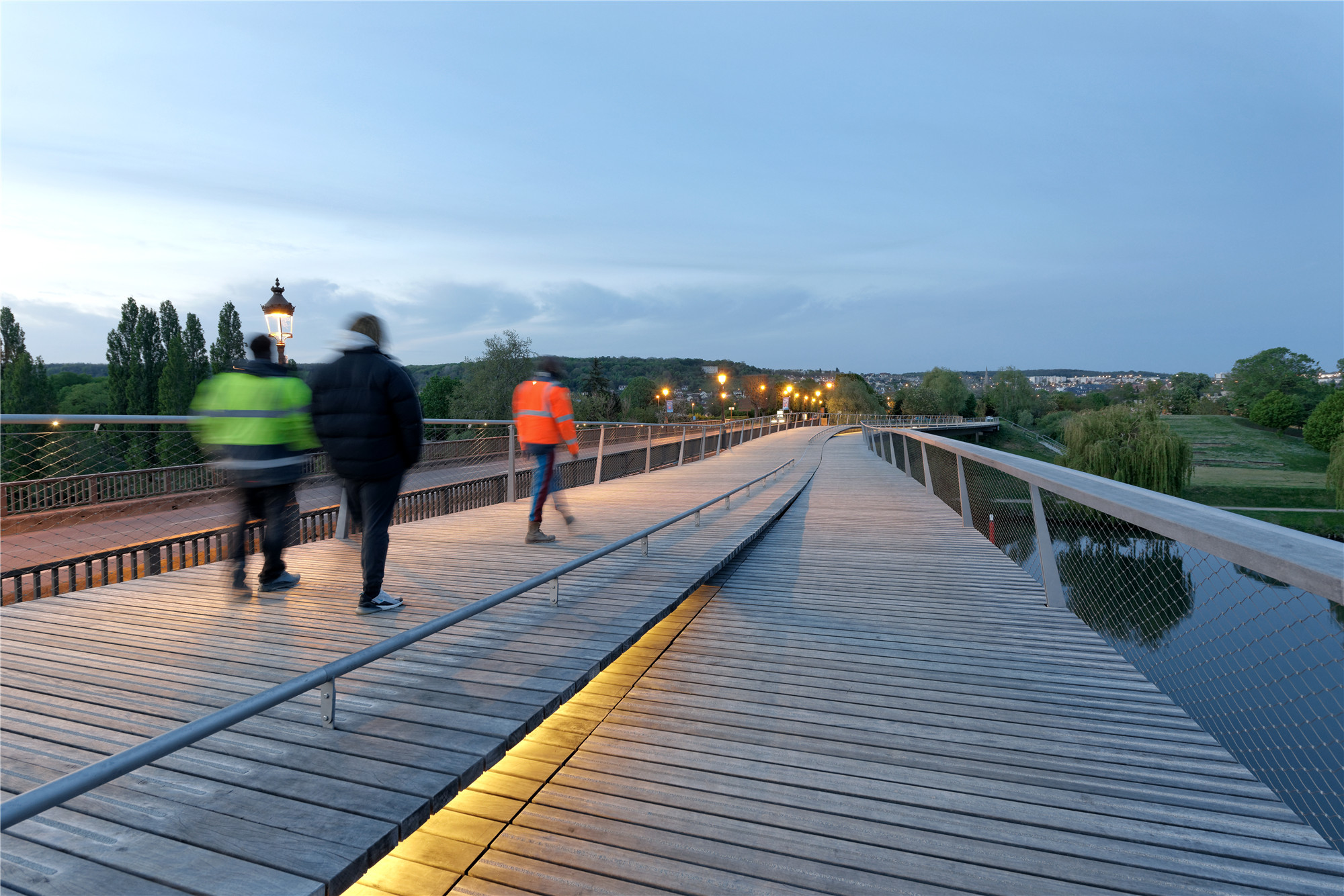 On the island, the deck flares out and lowers gently, the urban walkway continues round the open-air theatre like a balcony and brings the collegiate church into view. The route will be fully functional once the restoration work on the Vieux Pont, which will again link the Ile aux Dames to Limay to the north-east, has been completed. The northern part of the walk follows the blonde stone arches that link two wooded banks painted by Corot in 1869.