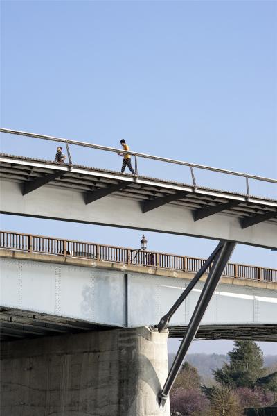 Dietmar Feichtinger's new soft mobility bridge over the Seine linking Mantes-la-Jolie and Limay is an invitation to embark on a veritable urban promenade. In the crook of one of the loops of the river that define the southern limit of the French Vexin, he has created a subtle staging for urban space and the natural landscape to meet. In the wooded shade of the hills that dominate the valley, between the high silhouette of the collegiate church of Notre-Dame and the streets of the ancient city on the north bank, the new pathway crosses two arms of the river, pausing only to rest on the wooded slope of the Ile aux Dames.