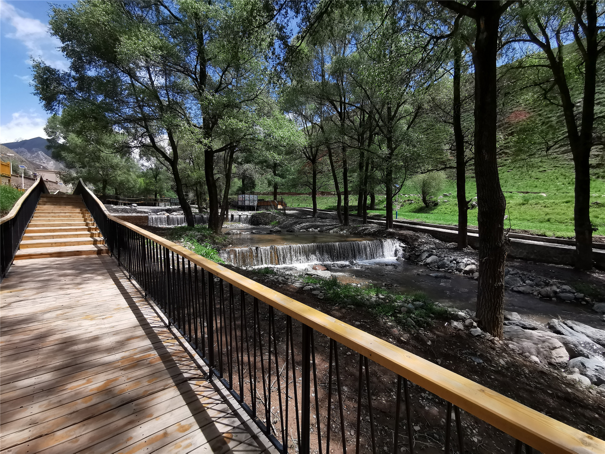 鄰里舒適場景建立在雪山匯集而成的溪流在西北高原彌足珍貴。設計希望抓住這片場地在退耕還草后的水環(huán)境再造機遇,重新構(gòu)建舒適的親水鄰里公共空間,采取理水以睦鄰的策略,針對現(xiàn)有水體進行了三段集中整治,形成具有跌落感的開合水溪關系,以棧道曲折臨水穿于其間,借局部高差與林中成臺地通幽之感,力求狹長場地中的“小中見大”。林間步行系統(tǒng)也與村民廣場形成了公共生活核心區(qū)的小閉環(huán)交通,增加了復合性功能的親水公共活動場地,改善了周邊村民的可達性與居住環(huán)境,提升村莊的鄰里空間親水舒適性。