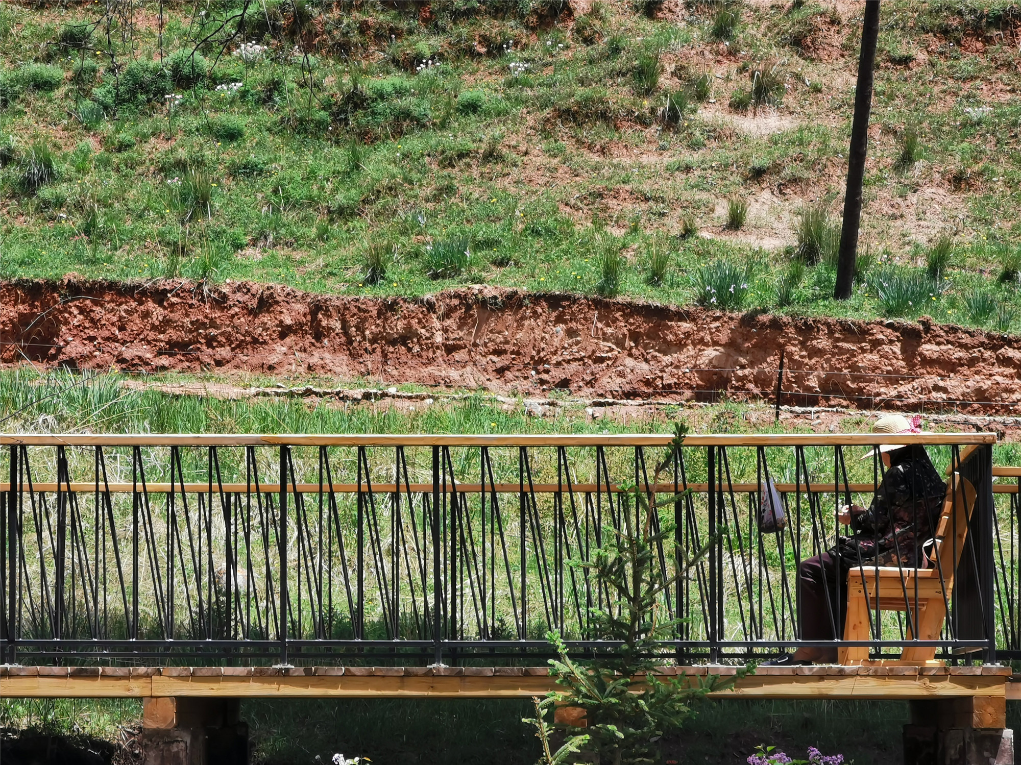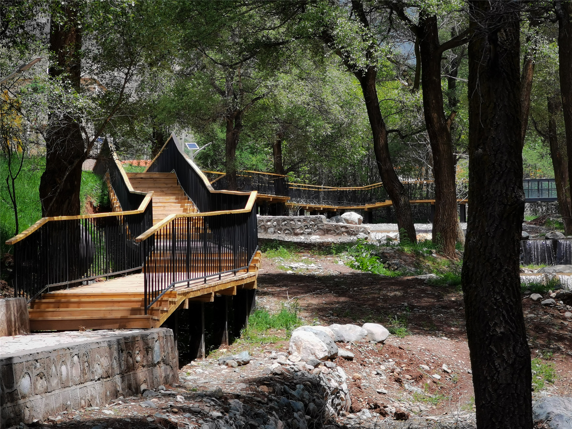 在思考白楊溝村公共空間的未來場景時,我們提出了“詩意自然、鄰里舒適”兩個層面的場景構(gòu)建。場景設計靈感源于傳統(tǒng)造園因借之法,以近乎消隱的棧道,從村口到白楊林再到青稞田旁打造了一系列展示龍鱗白楊的行望路徑,籍山林以造深景;時而橫臥跨水,時而蜿蜒入林,引人入勝于雪山溪流、白楊林間的秘境花園場景中。