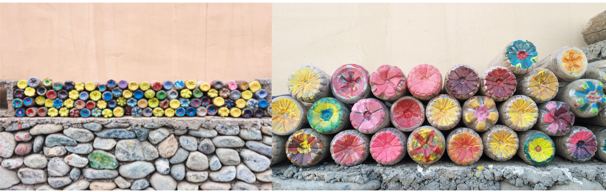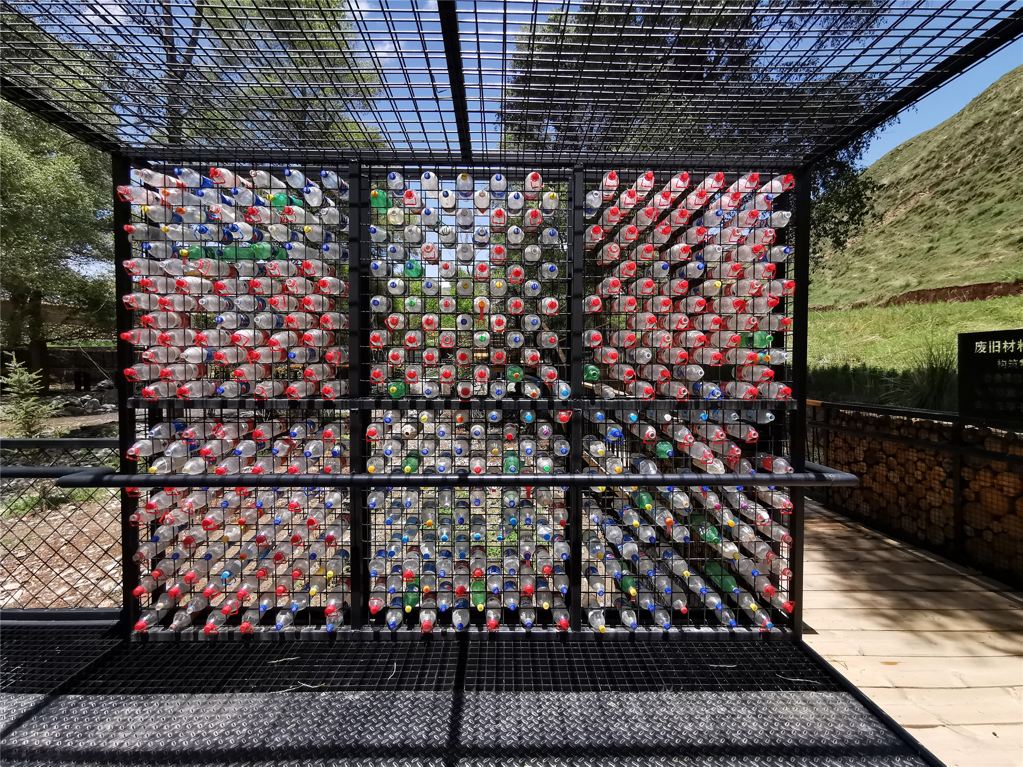 白楊溝村屬于多民族聚居的環(huán)境特色保護型村莊。我們在設計之初通過走訪調(diào)研發(fā)現(xiàn)留守民參與村莊建設的意愿強烈,但不知從何入手,因此設計團隊在建設前期進行了一場從廢物利用入手的藝術裝置營造實驗。景觀建筑師與社區(qū)營造團隊攜手以一場“會說話的墻”的活動展開了關于村莊環(huán)境治理的互動裝置構(gòu)思,環(huán)保裝置的材料就是游客丟在村莊的飲料瓶,因為塑料制品在地下掩埋超過一百年也無法分解,我們發(fā)動村民在搜集來的飲料瓶上進行彩繪,用這些百年無法分解的瓶子美化院墻與建造景觀設施,以一系列參與式的設計藝術活動展示“廢棄物”的另一面,重新凝聚關于美好家園環(huán)境保護與治理的民族共識,建立村民與自然環(huán)境的集體記憶,營造共享共建的村莊環(huán)境治理小閉環(huán)。