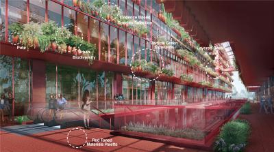 Here landscape and architecture blur the conventional inter-disciplinary lines with a bold and vivid biophilic response to culture, urban biodiversity and place that explores what future urban living can be.