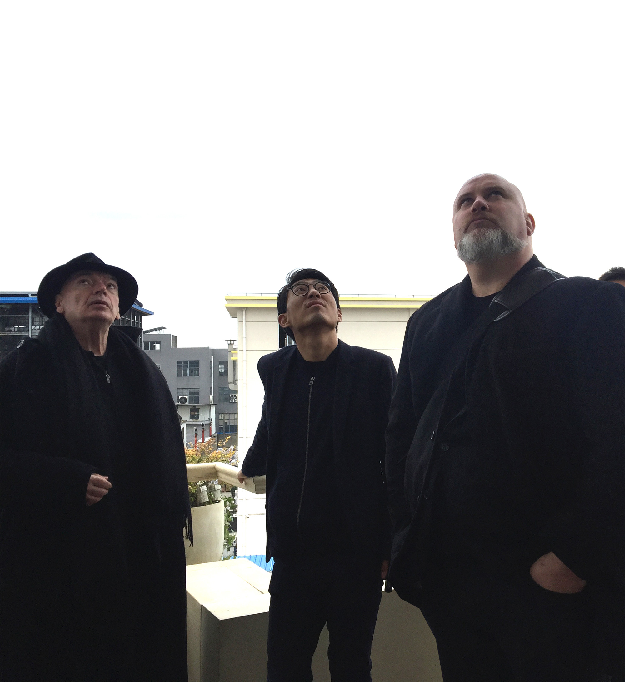 The three chief designers of this project, architect Jean Nouvel, Chen Chen (head of AJN China), Stephen Buckle (from left to right)