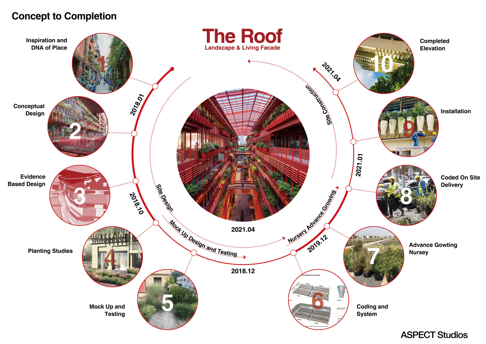 早在2018年初的時候,ASPECT Studios接到旭輝集團(tuán)的委托,作為主景觀設(shè)計顧問加入到由法國著名建筑大師讓?努維爾(Jean Nouvel)領(lǐng)銜設(shè)計的The Roof項(xiàng)目中,為這座標(biāo)志性建筑提供景觀設(shè)計和主體立面的生態(tài)垂直綠化設(shè)計。在項(xiàng)目設(shè)計的過程中,與項(xiàng)目場地相鄰幾個街區(qū)的ASPECT Studios上海團(tuán)隊(duì)擁有對項(xiàng)目得天獨(dú)厚的優(yōu)勢,那便是對項(xiàng)目的透徹分析,本土文化的真正理解,對里弄空間的深入感知,以及對社區(qū)活動的觀察入微,所有的這些都為最終呈現(xiàn)出恰如其分的設(shè)計成果與實(shí)現(xiàn)項(xiàng)目美好愿景打下堅(jiān)實(shí)的基礎(chǔ)。團(tuán)隊(duì)的設(shè)計工作從項(xiàng)目概念階段之初介入,經(jīng)歷概念設(shè)計,方案設(shè)計,深化設(shè)計,施工圖設(shè)計審核,以及現(xiàn)場施工階段。