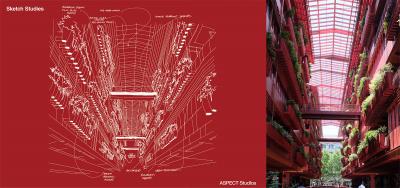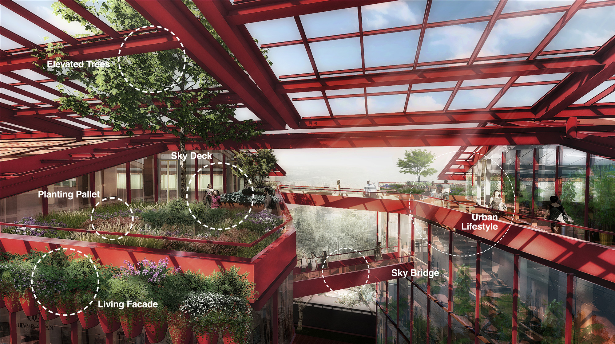 綠色植物被引入城市建筑空間內(nèi)部并吸引了自然生物的到訪,這將會將豐富自然生物帶入城市,最終在城市中創(chuàng)造一個四季變化的自然藍(lán)圖,從地面到上層的立體花園,吸引鳥兒、蜜蜂、蝴蝶和蜻蜓環(huán)繞在城市中。