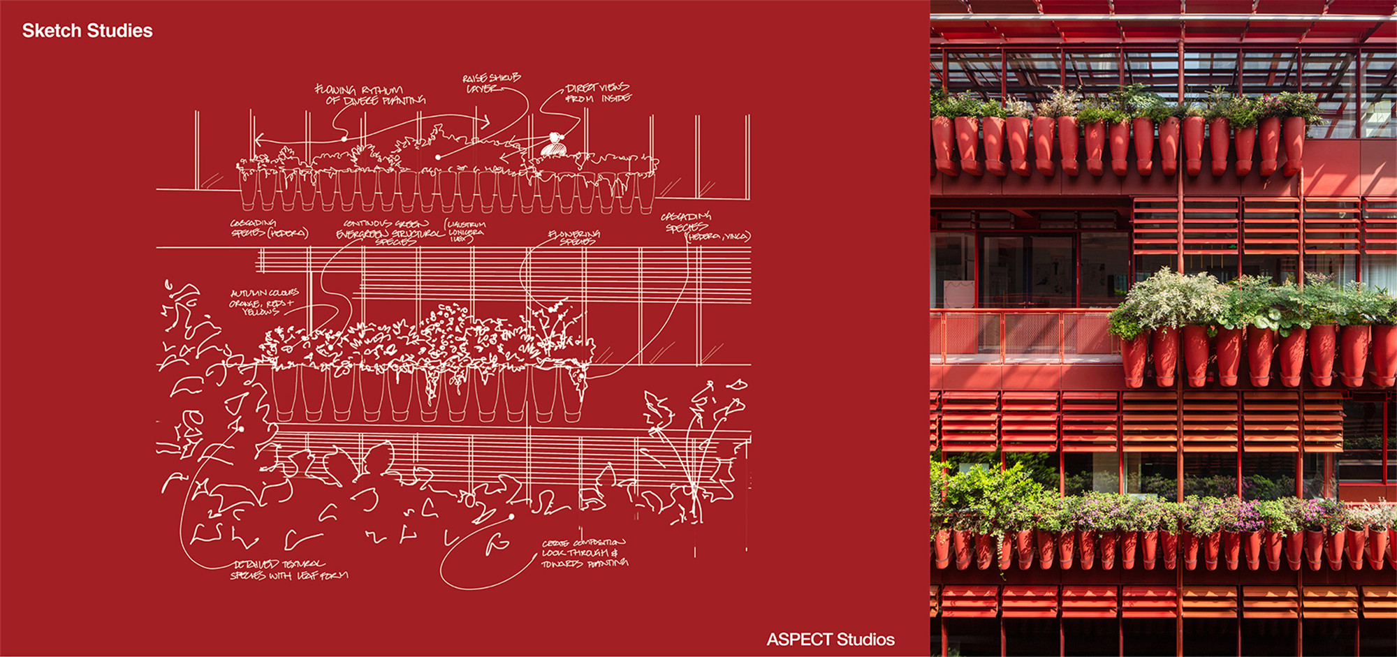 At the early stages of the design, the team collected data on solar, wind, sun, and other micro-climate related factors that cover both the building and surroundings This data was digitally analyzed in depth using the latest micro climatic modelling tools. This was then used to inform the detailed selection of plant species suitable for the exact conditions of each facade pot, its orientation, elevation, and pot size.