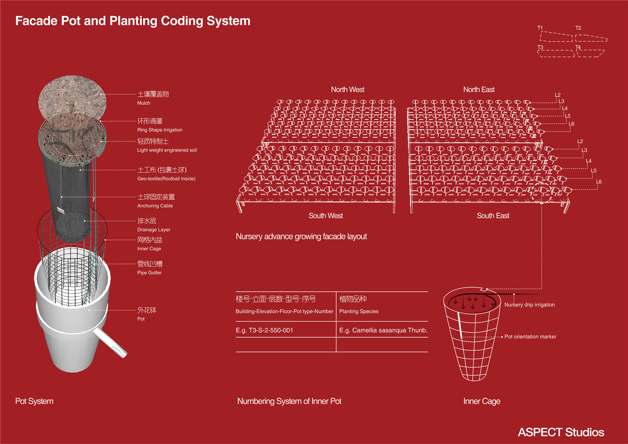 為了確保可以掌握種植情況以及保證種植后的生長成功率,我們還設(shè)置了編碼系統(tǒng),該系統(tǒng)定義了每個立面、豎向、朝向、層高、花缽位置以及植物的種類。