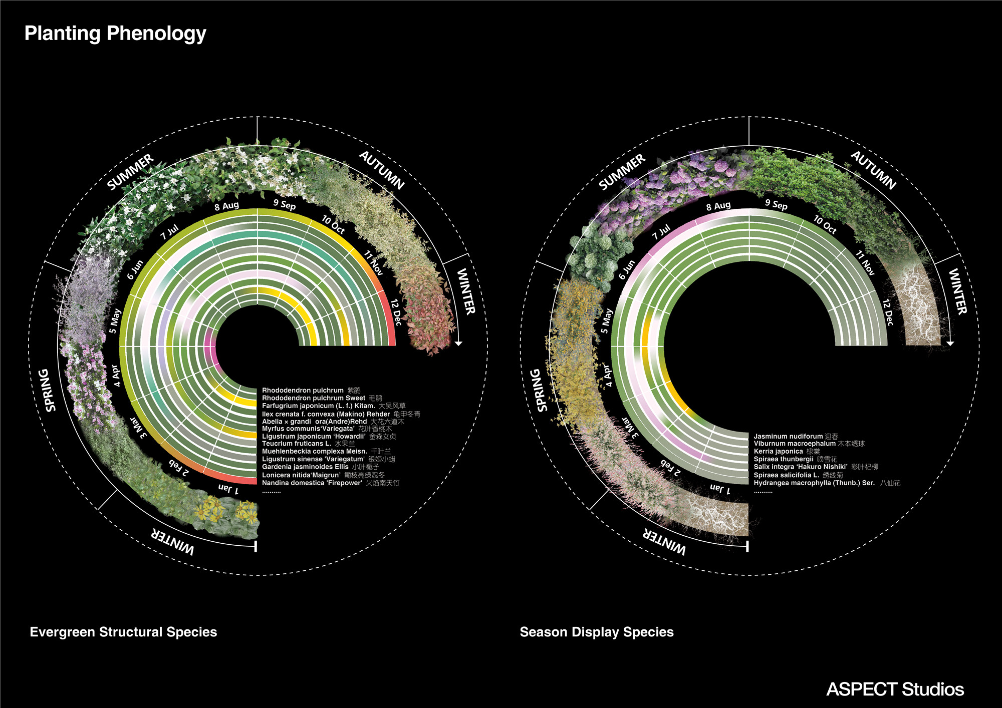 All Year Structural Species – using a range of evergreen species to ensure an all-year basis of the design, a diverse mix of evergreen species were selected for their suitability to create a robust skeleton to the design, these consisted of shrubs and cascading species suitable to the climatic condition. The following species helped to define the all yeah planting framework: Farfugrium japonicum (L. f.) Kitam., Rhododendron pulchrum Sweet, Ilex crenata f. convexa (Makino) Reh der, Myrfus communis‘Variegata’, Nandina domestica 'Firepower', Ligustrum japonicum ‘Howardii’, Abelia × grandiflora(Andre)Rehd, Muehlenbeckia complexa Meisn., Teucrium fruticans L., Ligustrum sinense 'Variegatum', Gardenia jasminoides Ellis, Rhododendron pulchrum Sweet, Lonicera nitida‘Maigrun’, etc.