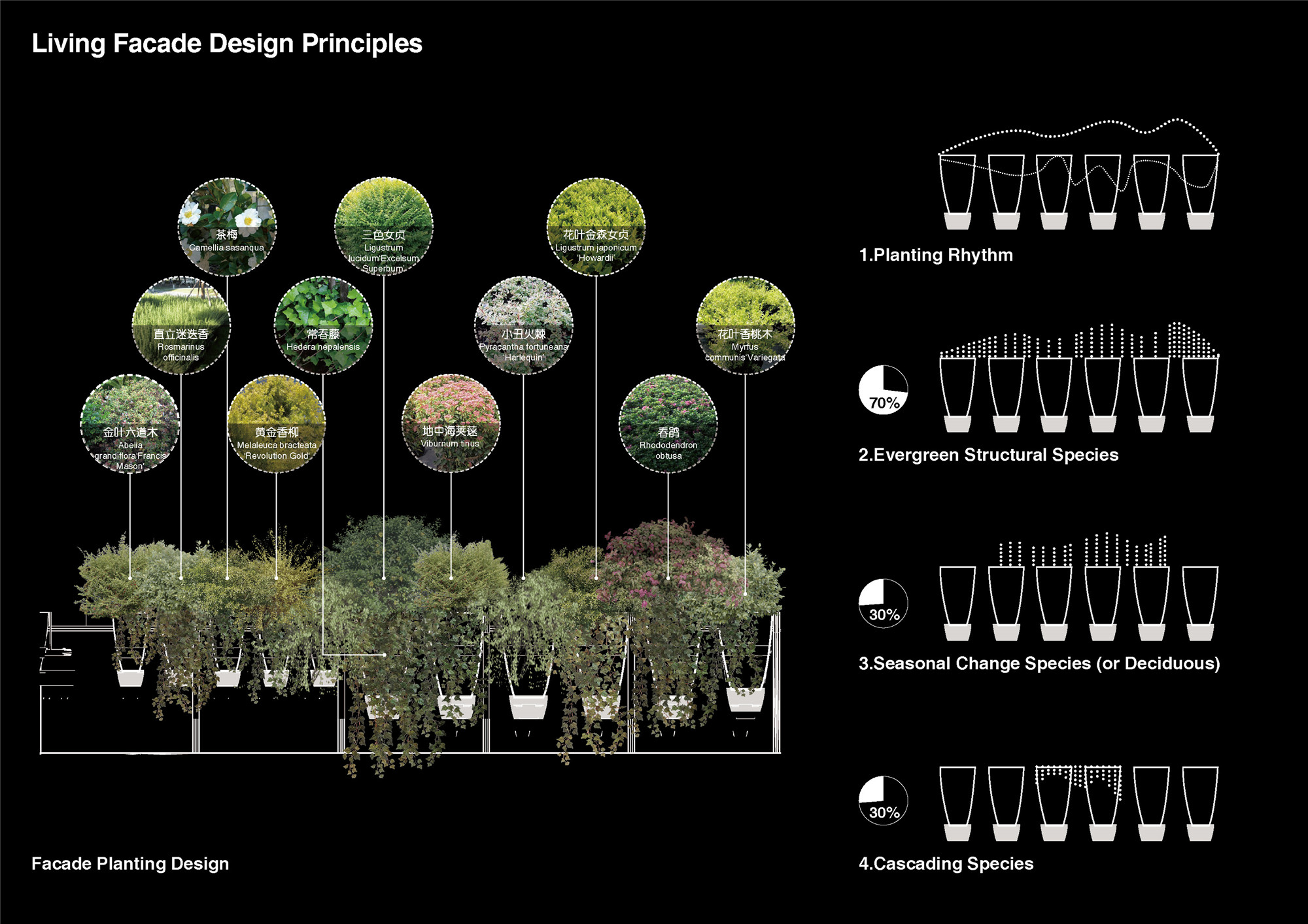 季節(jié)性變化的物種——幫助增加城市的生物多樣性,設(shè)計的目的是創(chuàng)造一個充滿生機(jī)的生態(tài)立面,并可以反映上海本土的季節(jié)性特征。以下被選擇的植物展現(xiàn)了其在一年四季變化中絢爛色彩 記錄不同時刻的美麗。他們包括繡球花、繡線菊、杞柳、紅葉石楠 、藍(lán)羊茅等。